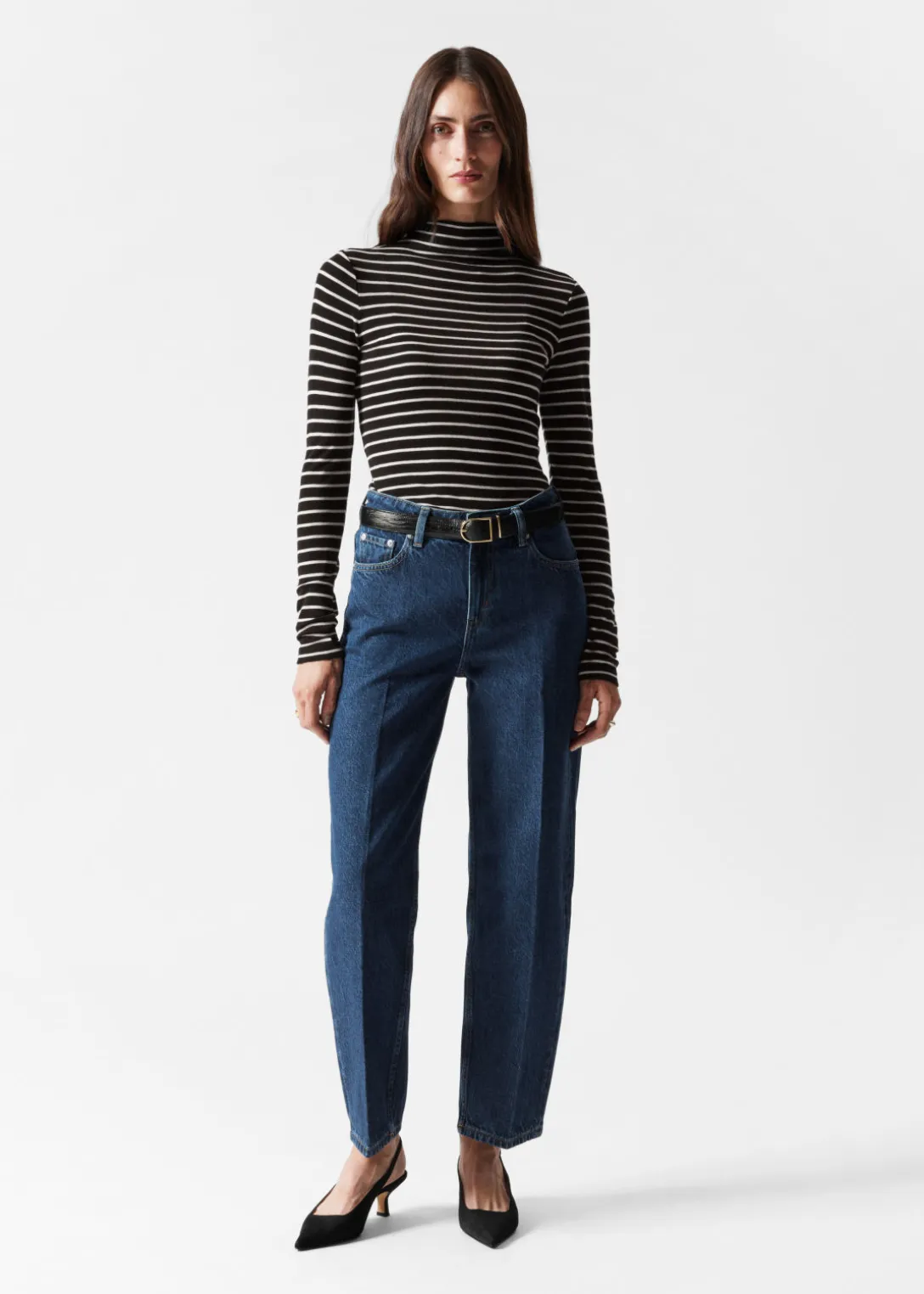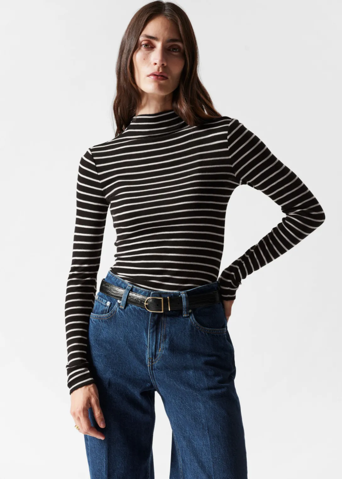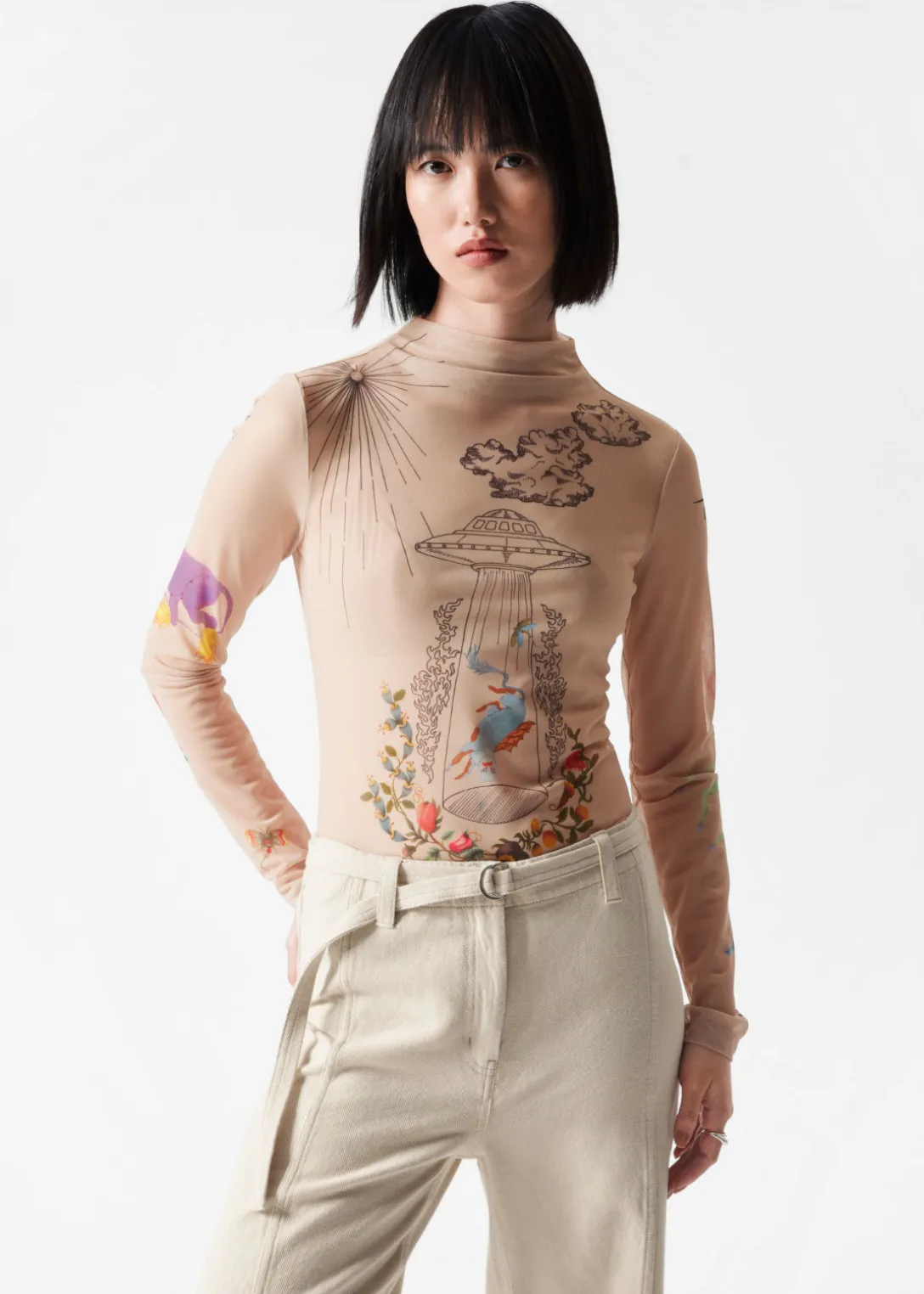 Haut imprimé et ajusté, avec un col montant et des manches longues.