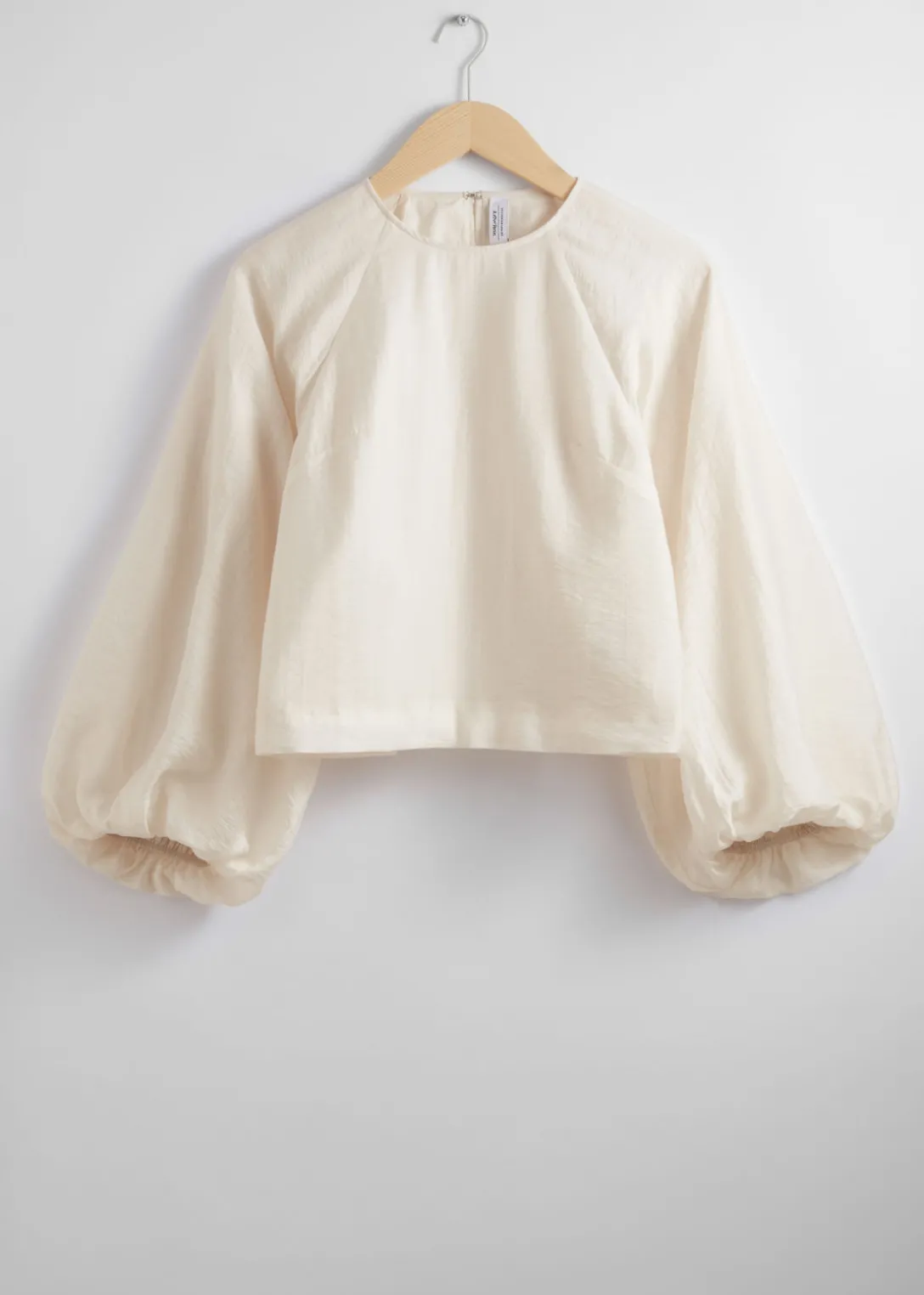 Haut avec une encolure arrondie et des manches bouffantes longues aux poignets froncés.
