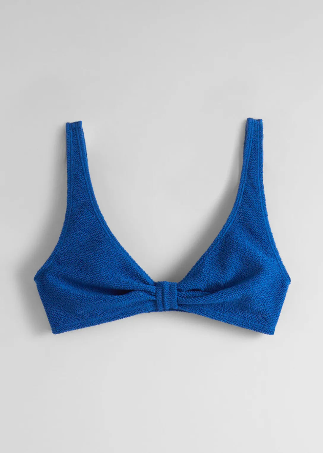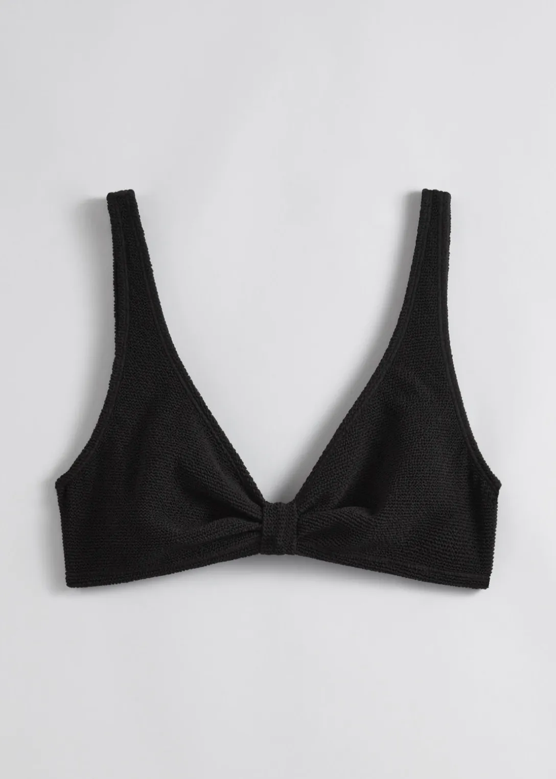 Haut de bikini triangle avec une finition texturée rappelant le tissu éponge.