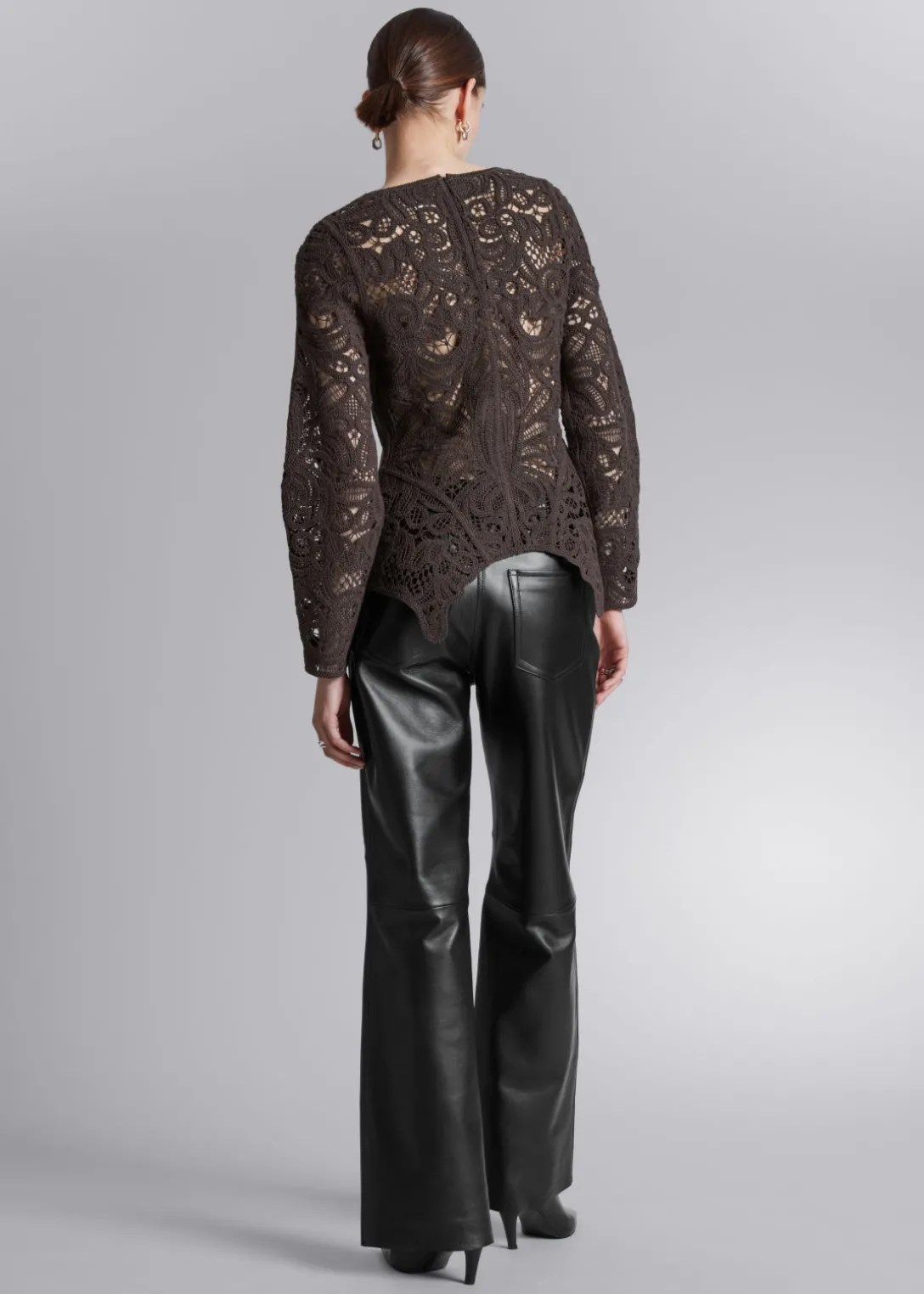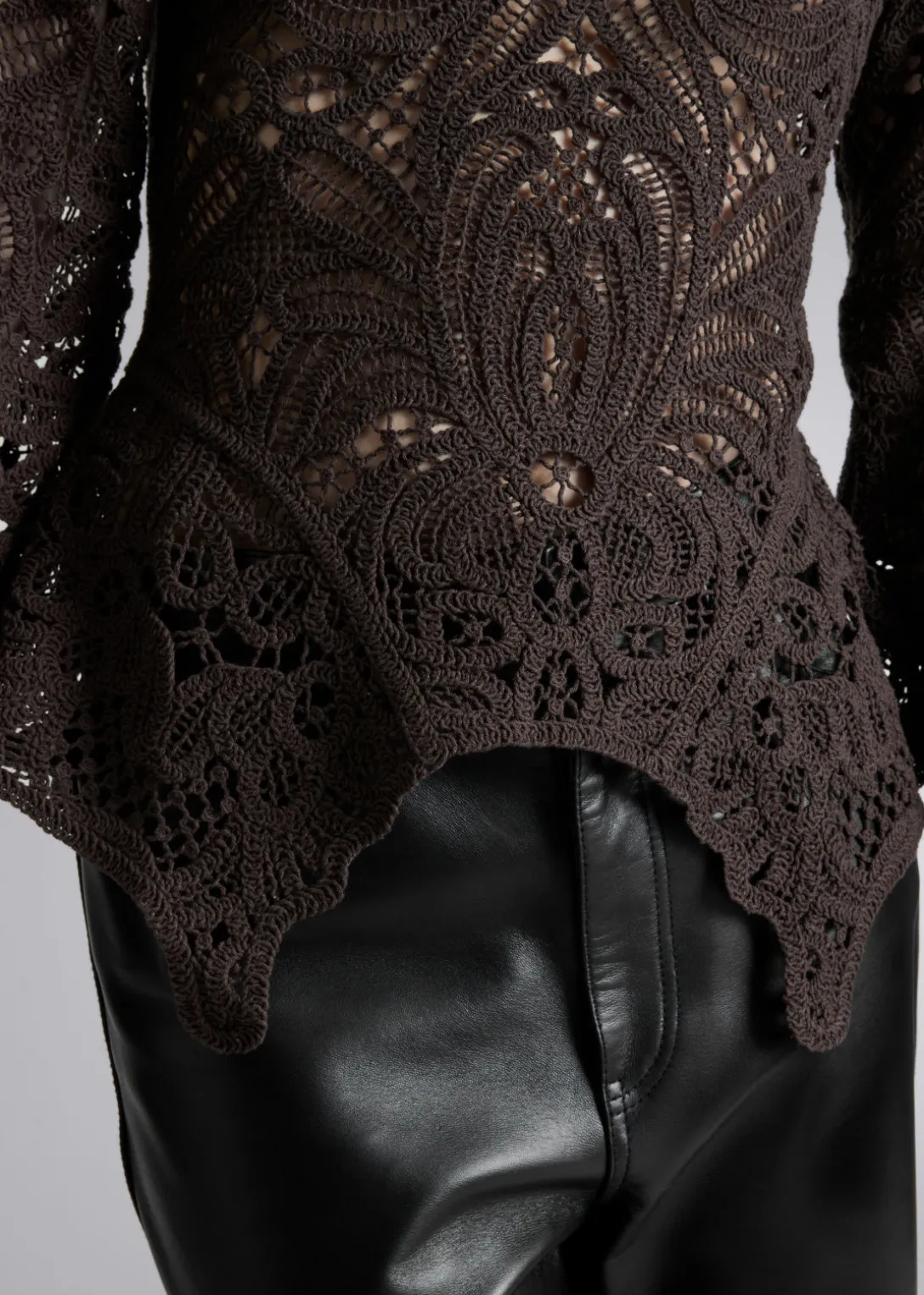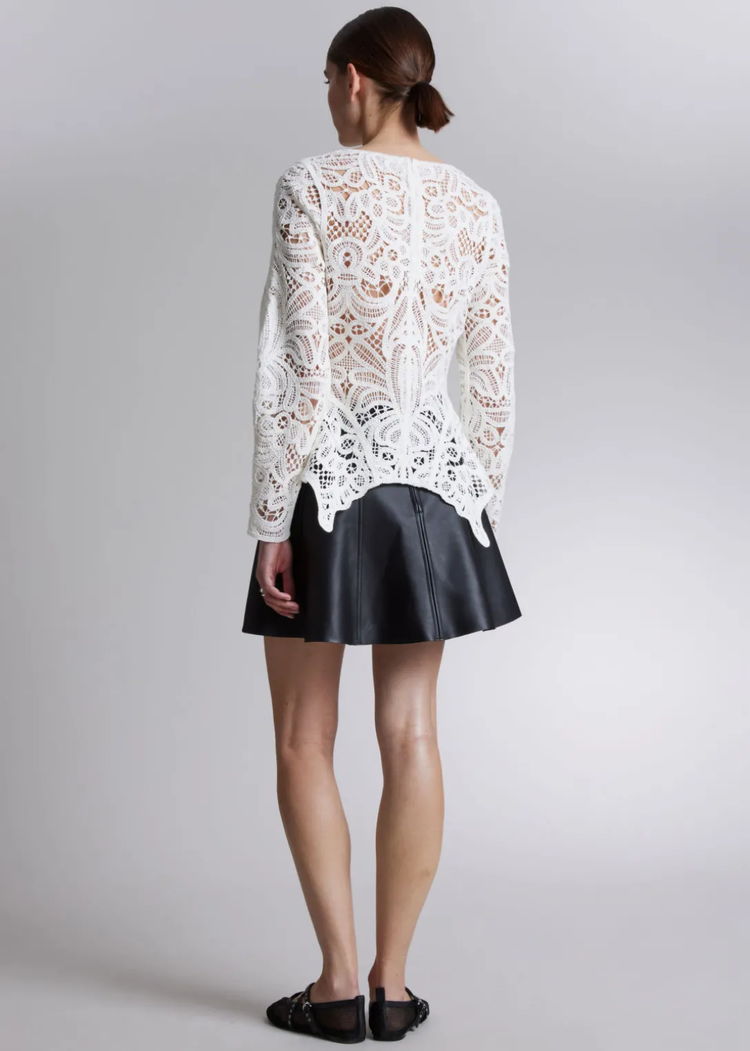 Haut en dentelle crochetée, avec des manches longues et un motif d’inspiration florale sur l’ensemble. Doté d’un ourlet basque incurvé.