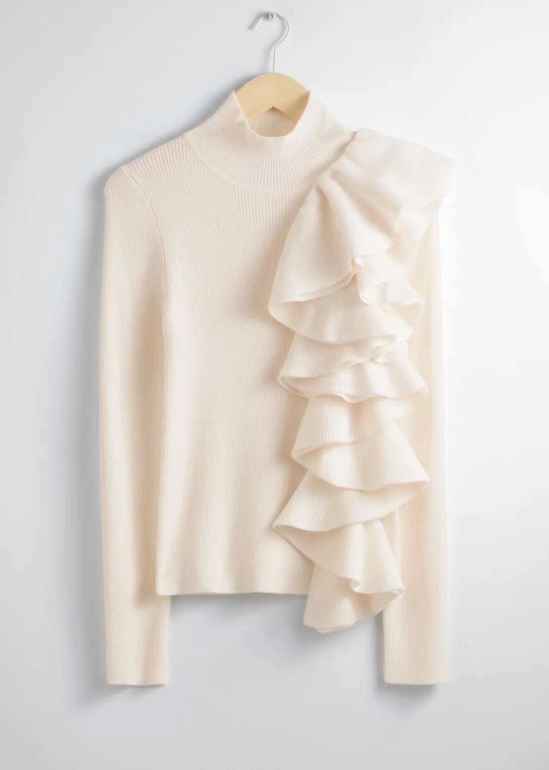 Haut en laine, avec un col montant et une cascade de volants d’un côté.