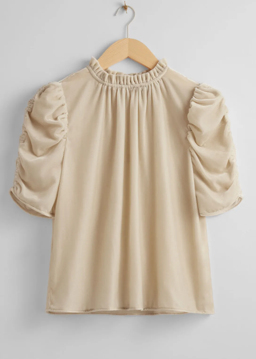 Haut en velours, avec manches ballon froncées et encolure volantée.