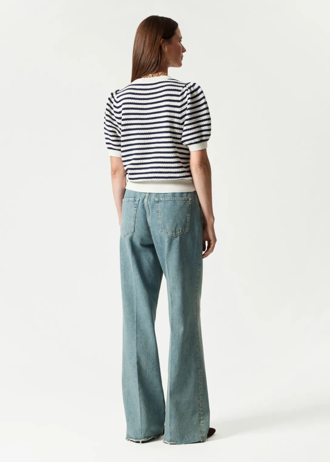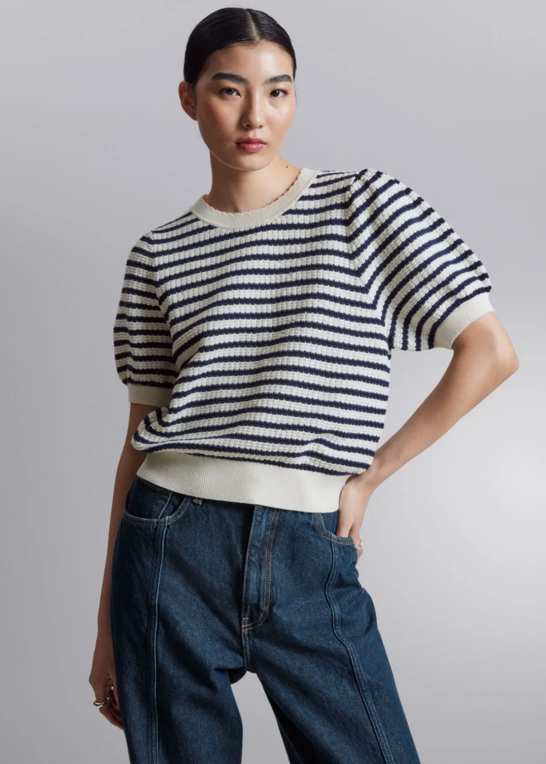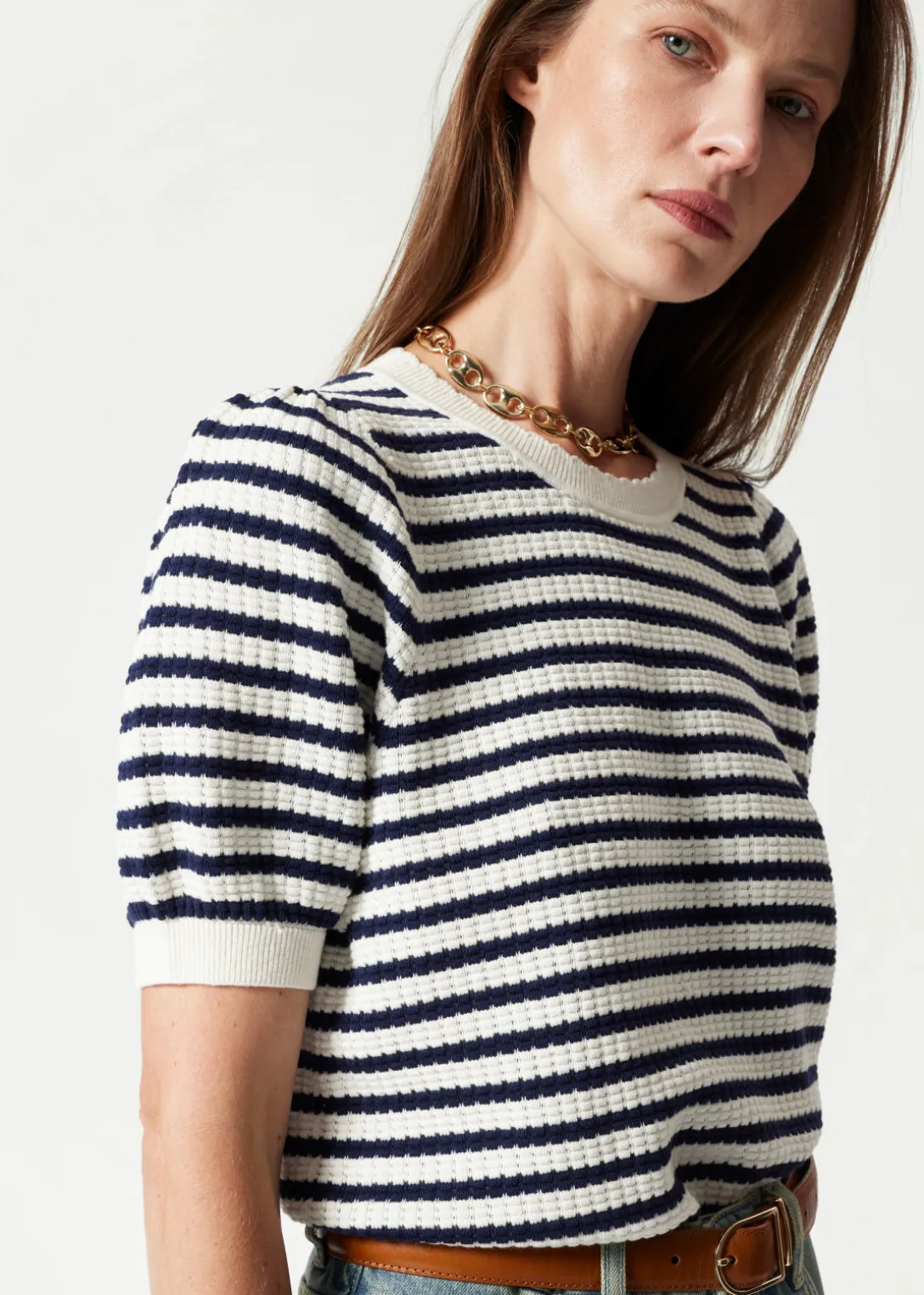 Haut en maille, avec des manches ballon et une encolure festonnée.