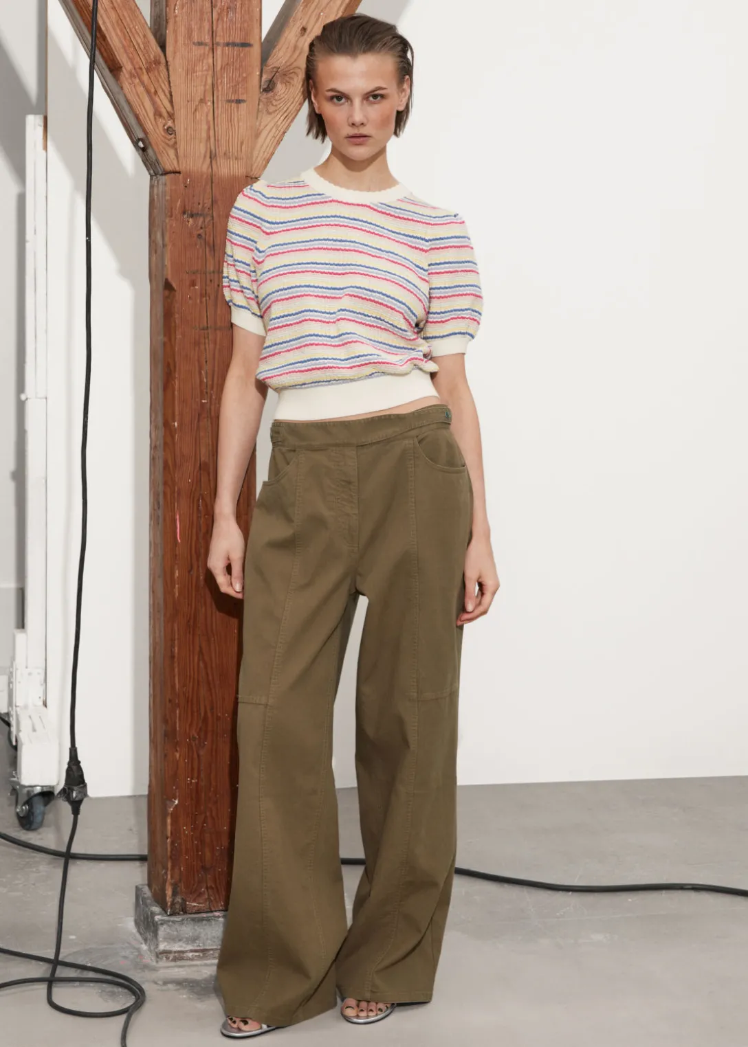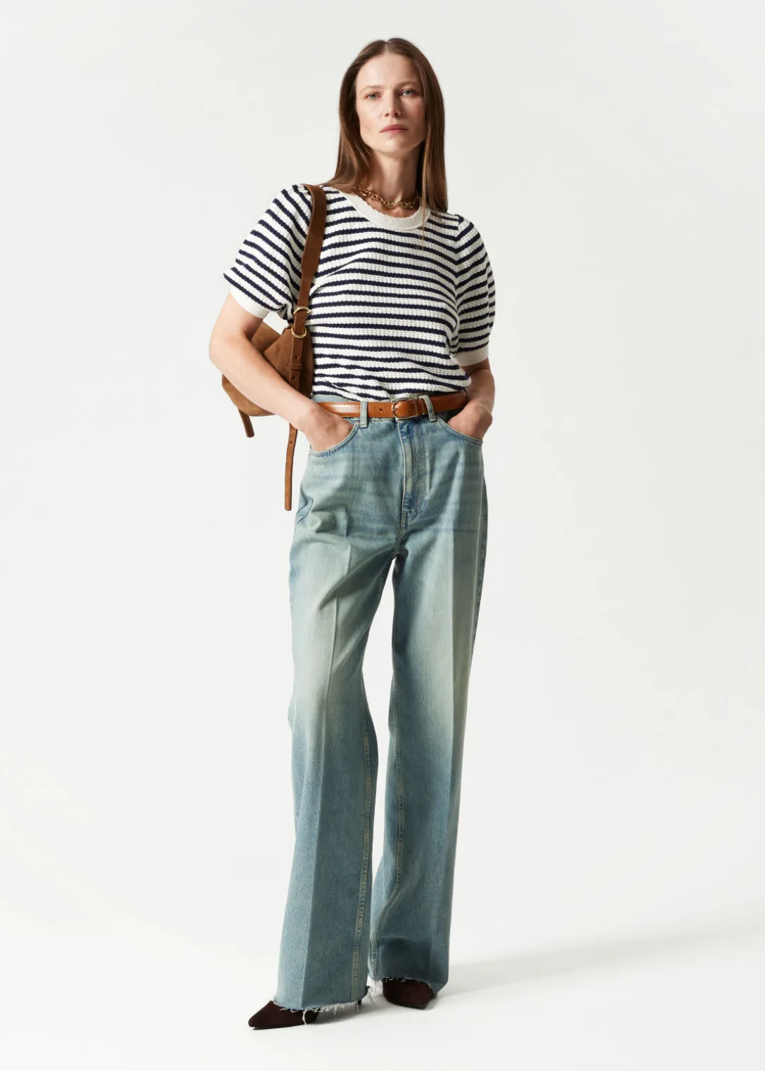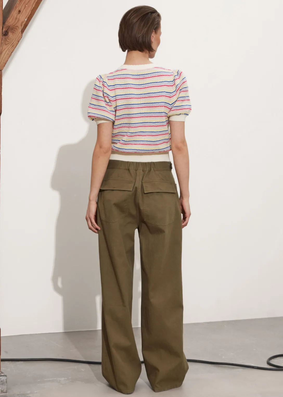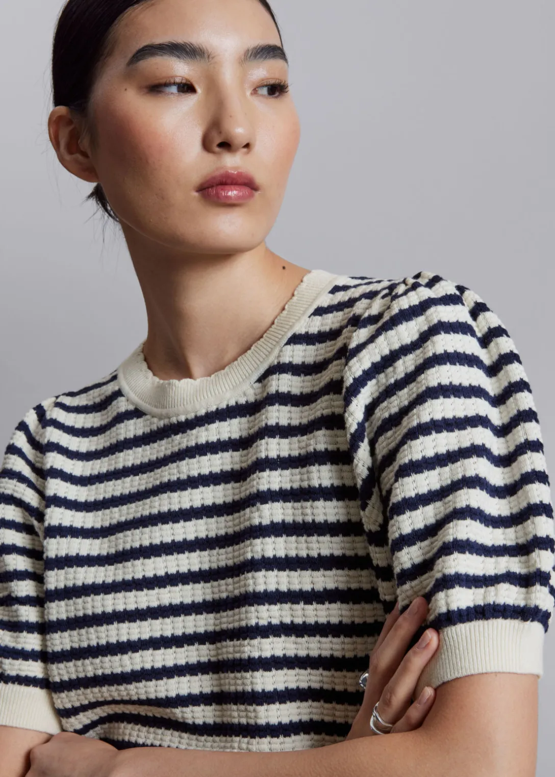Haut en maille, avec des manches ballon et une encolure festonnée.