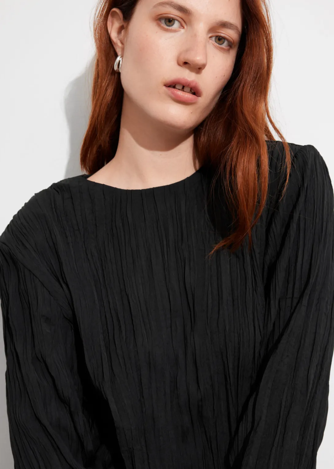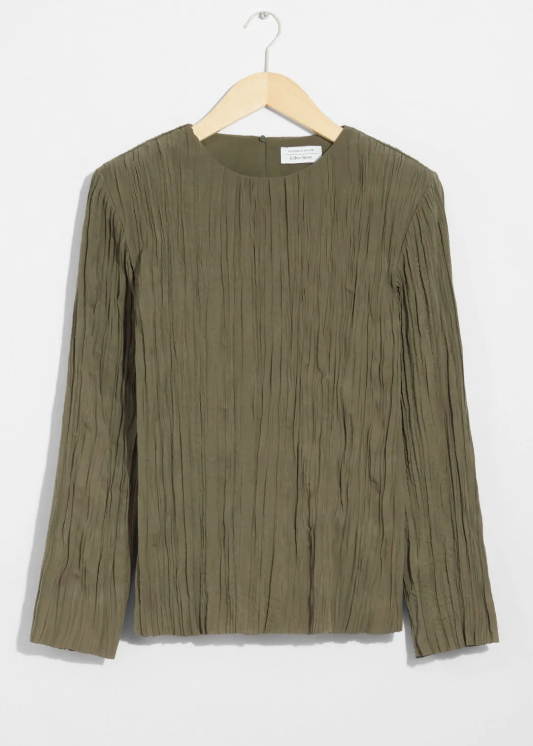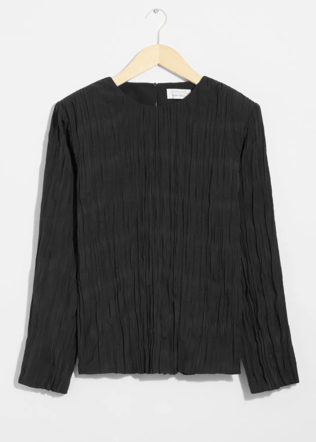 Haut à finition froissée, avec des manches longues à épaulettes.