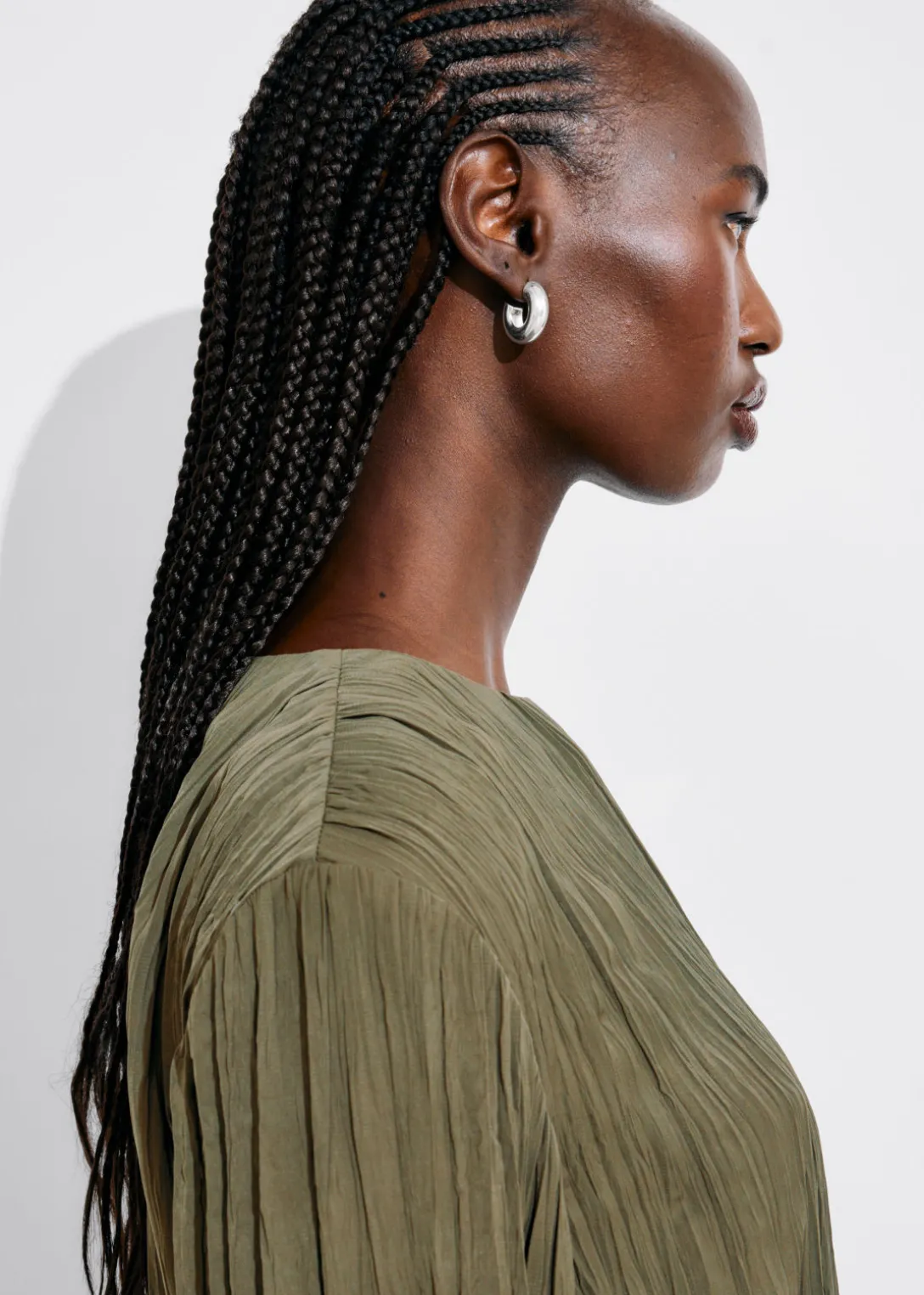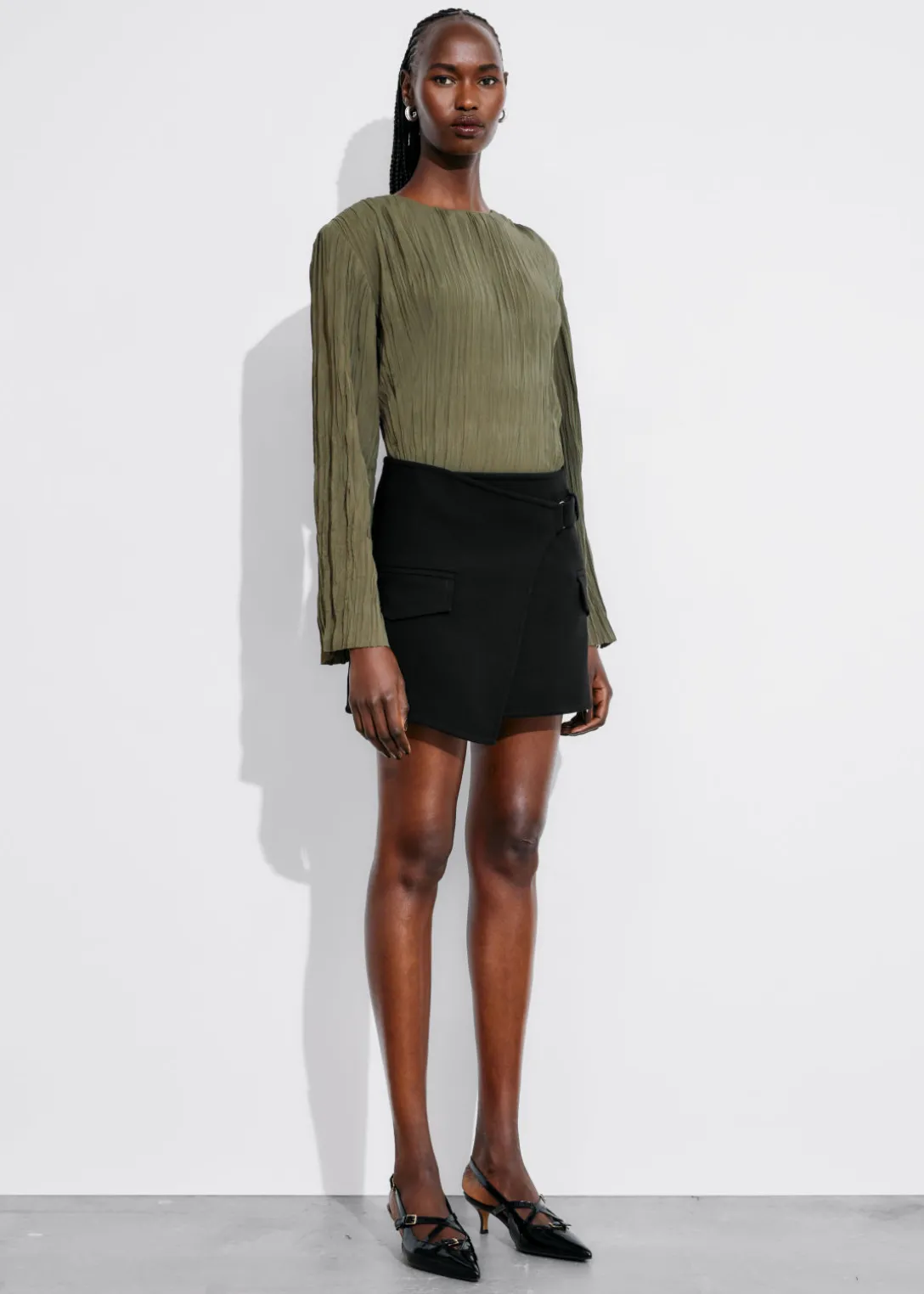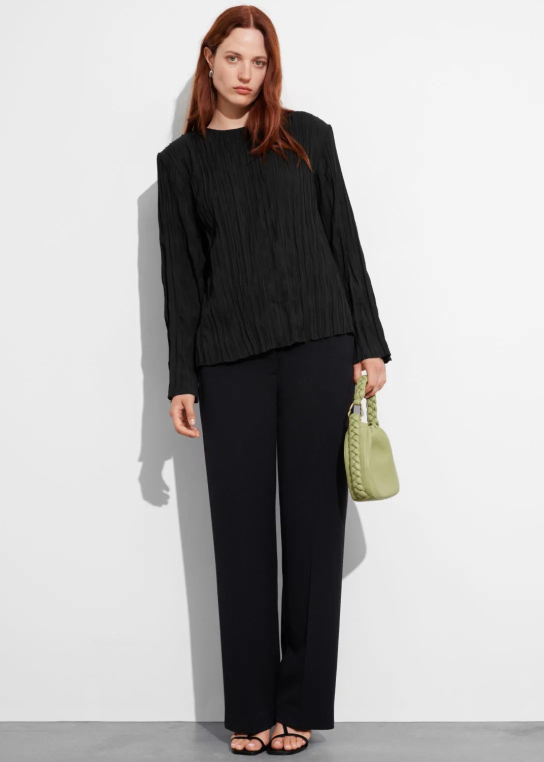 Haut à finition froissée, avec des manches longues à épaulettes.