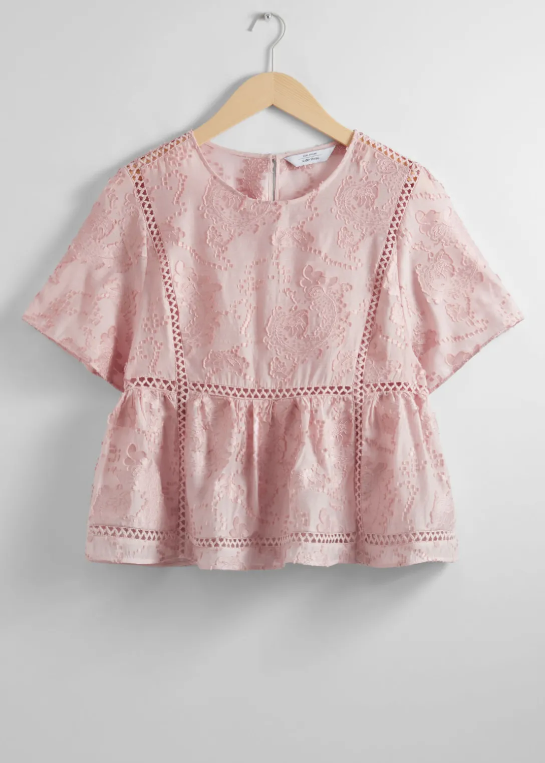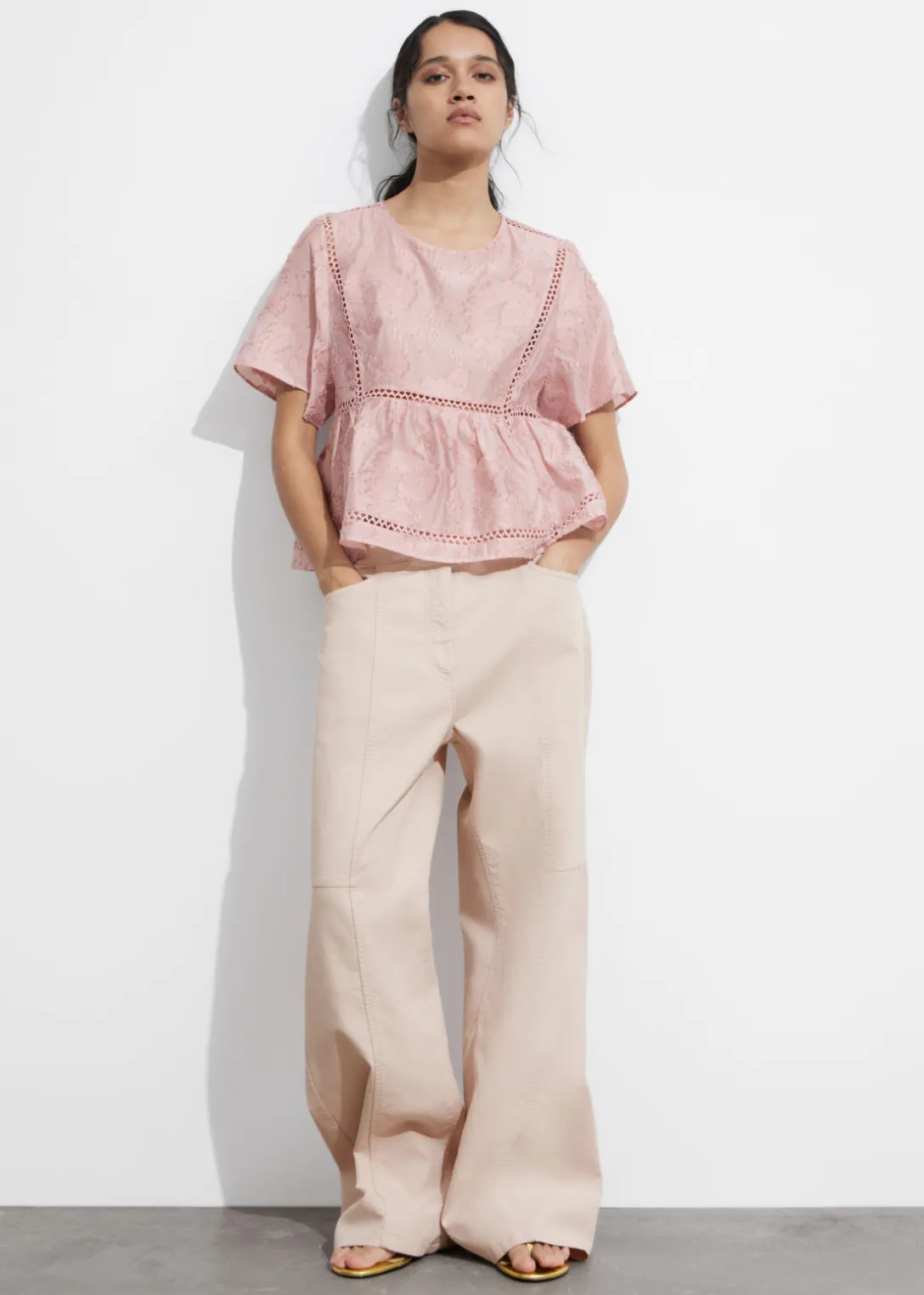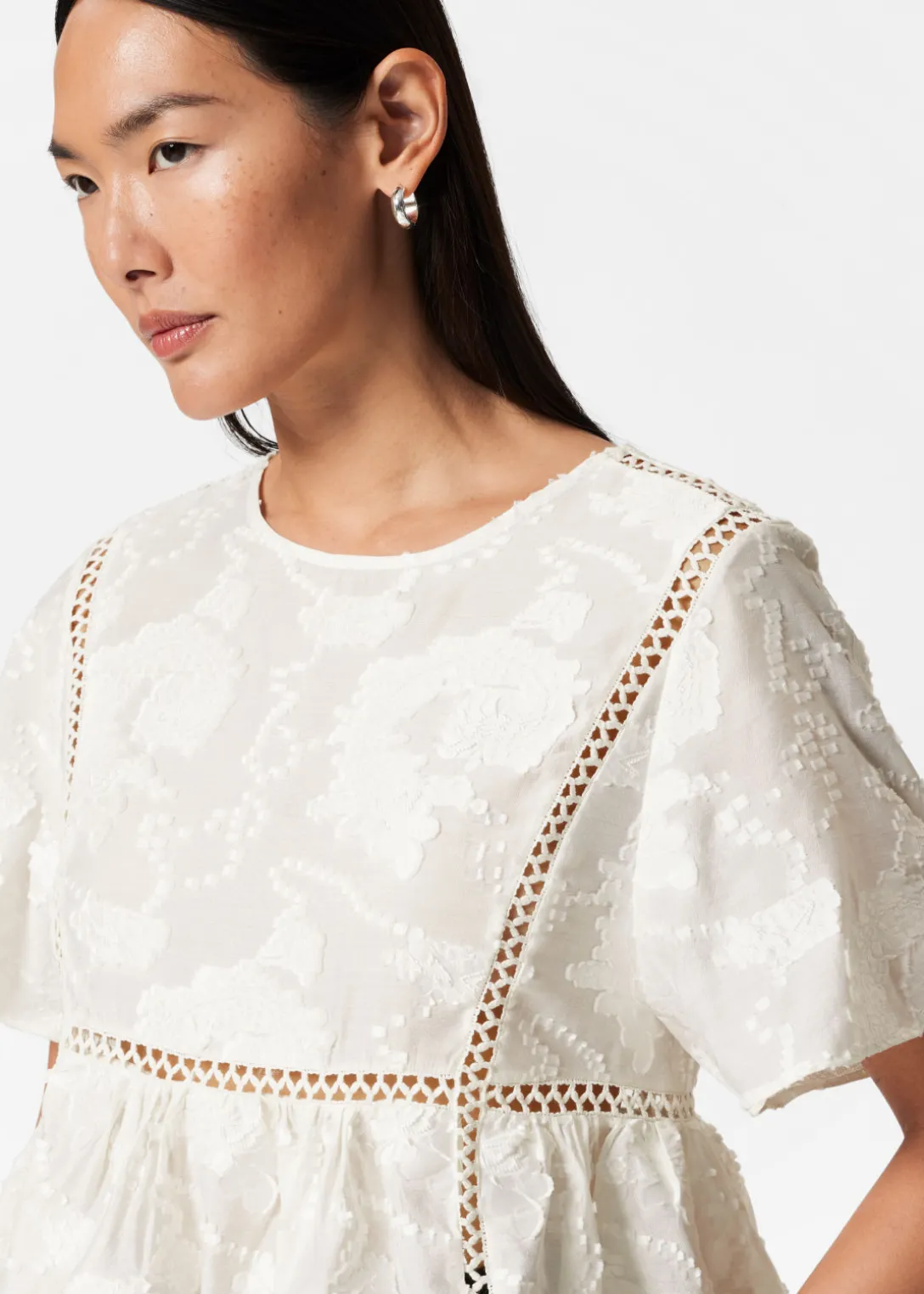 Blouse texturée avec des manches courtes et une taille accentuée créant une silhouette inspirée d’une basque.