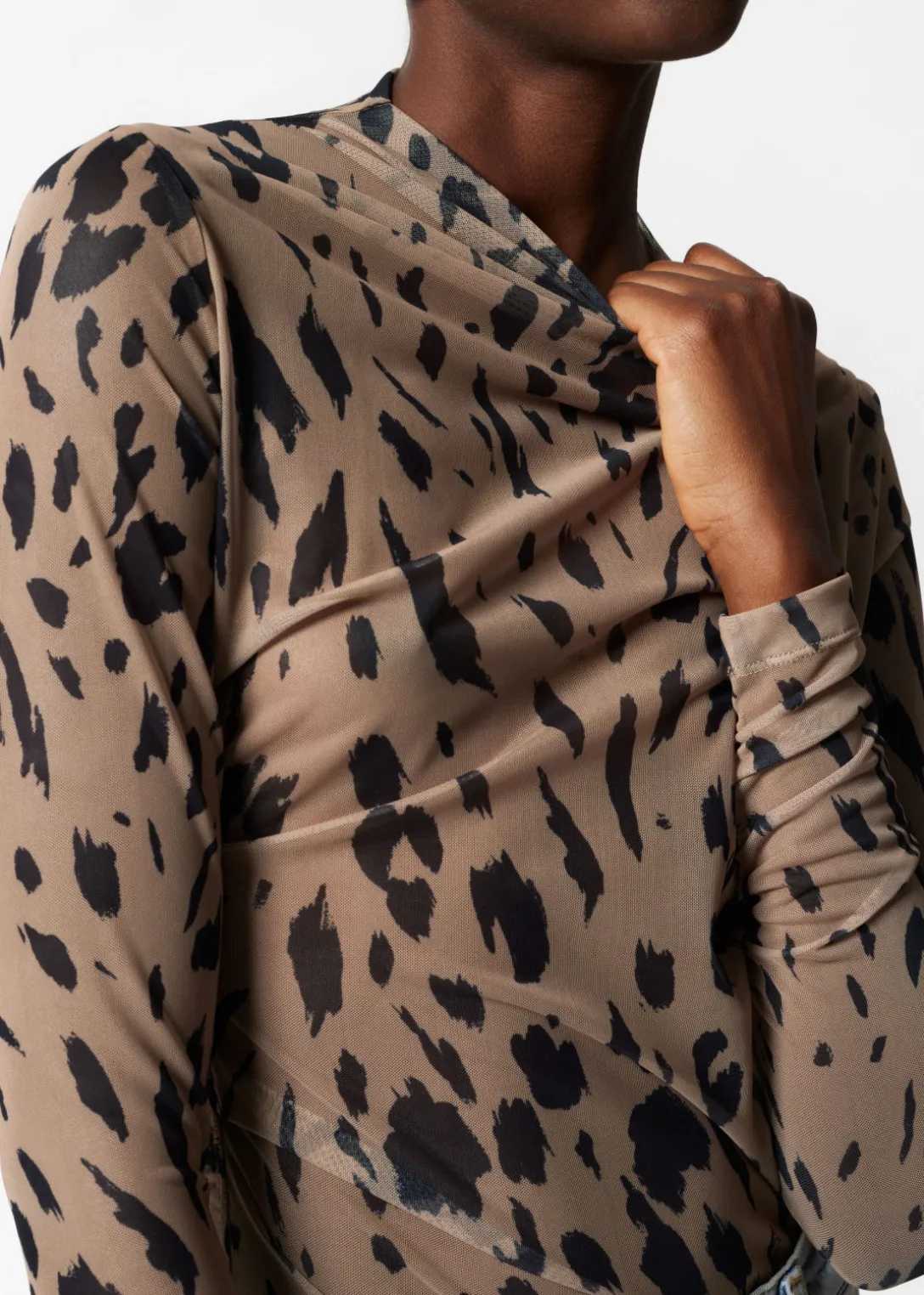 Haut transparent à manches longues, avec un col montant et une finition légèrement drapée.
