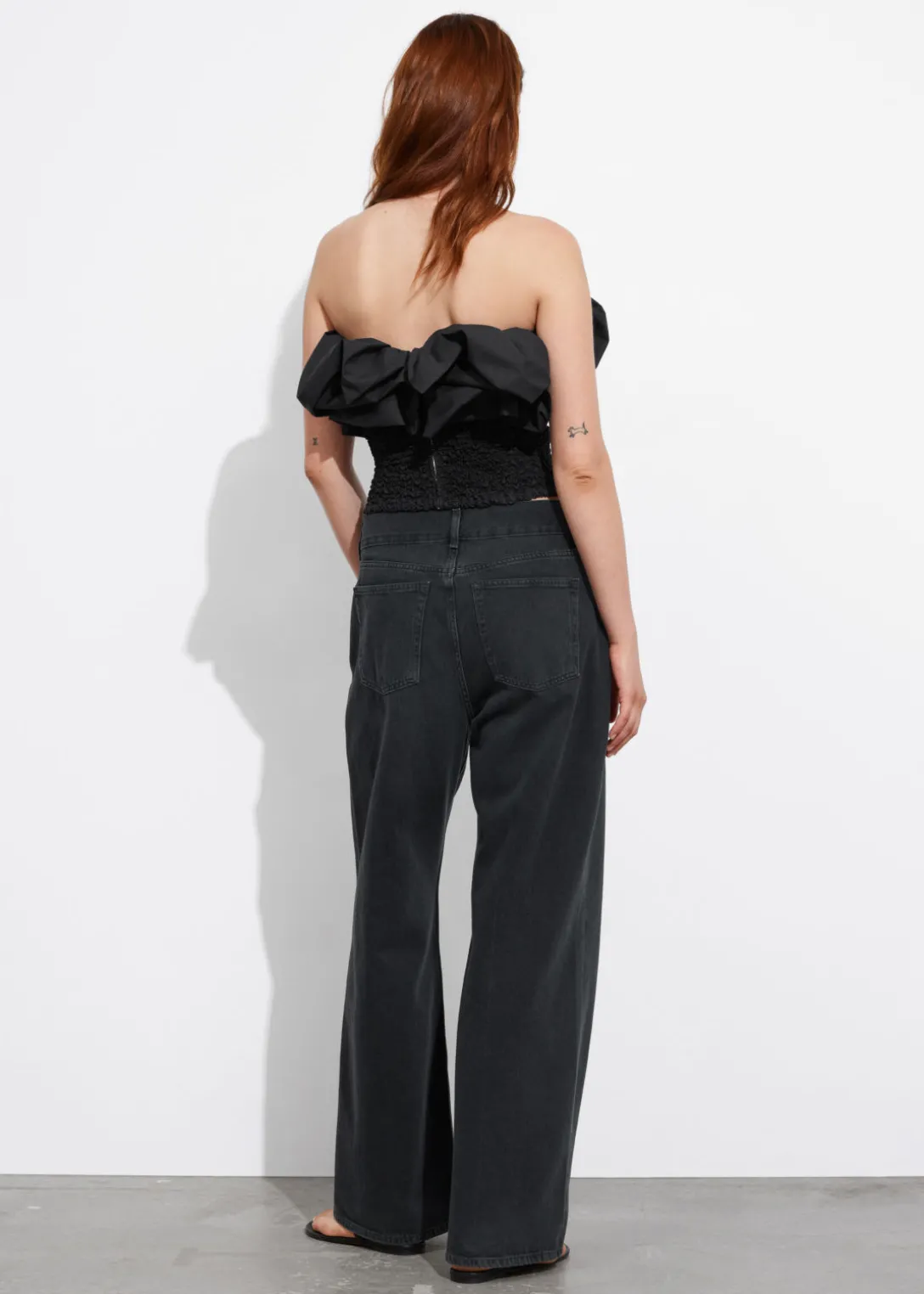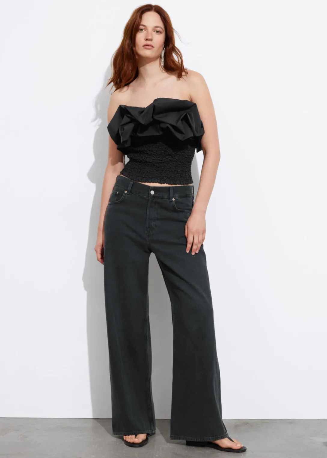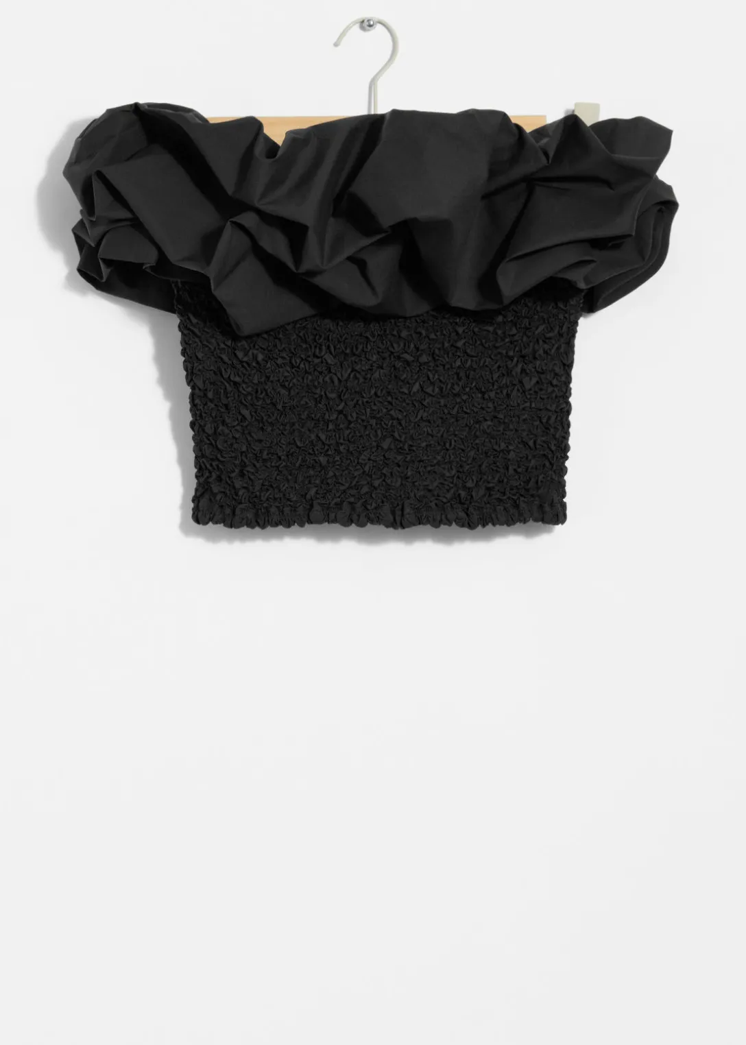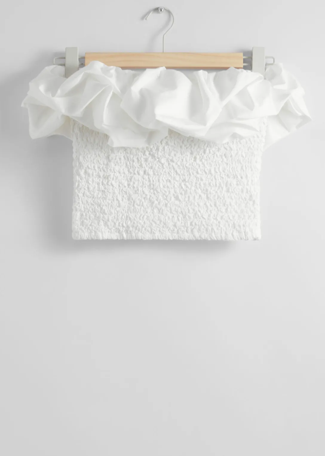 Haut aux épaules dégagées, avec une encolure vaporeuse et une finition à smocks. Doté d’une fermeture zippée au dos.