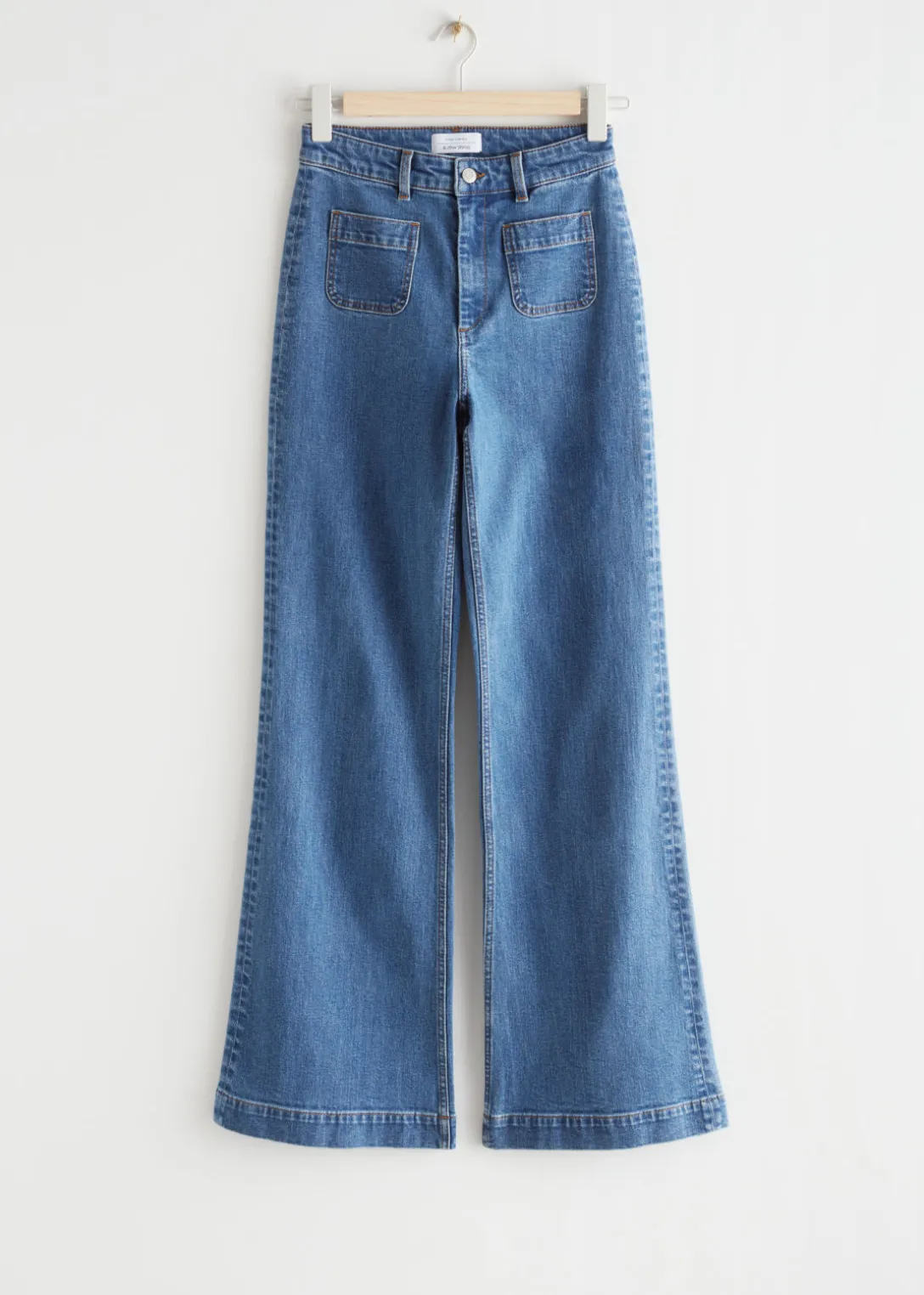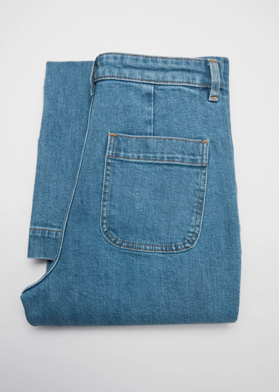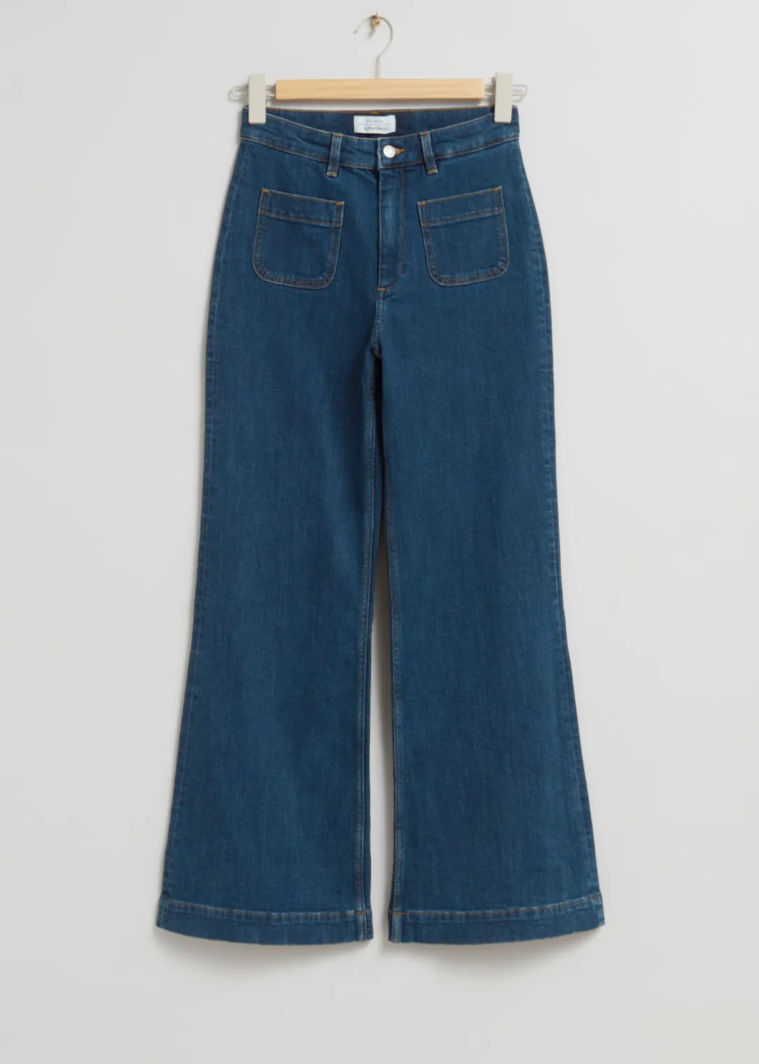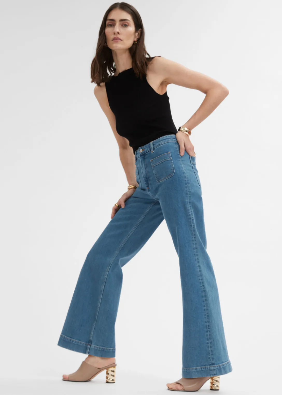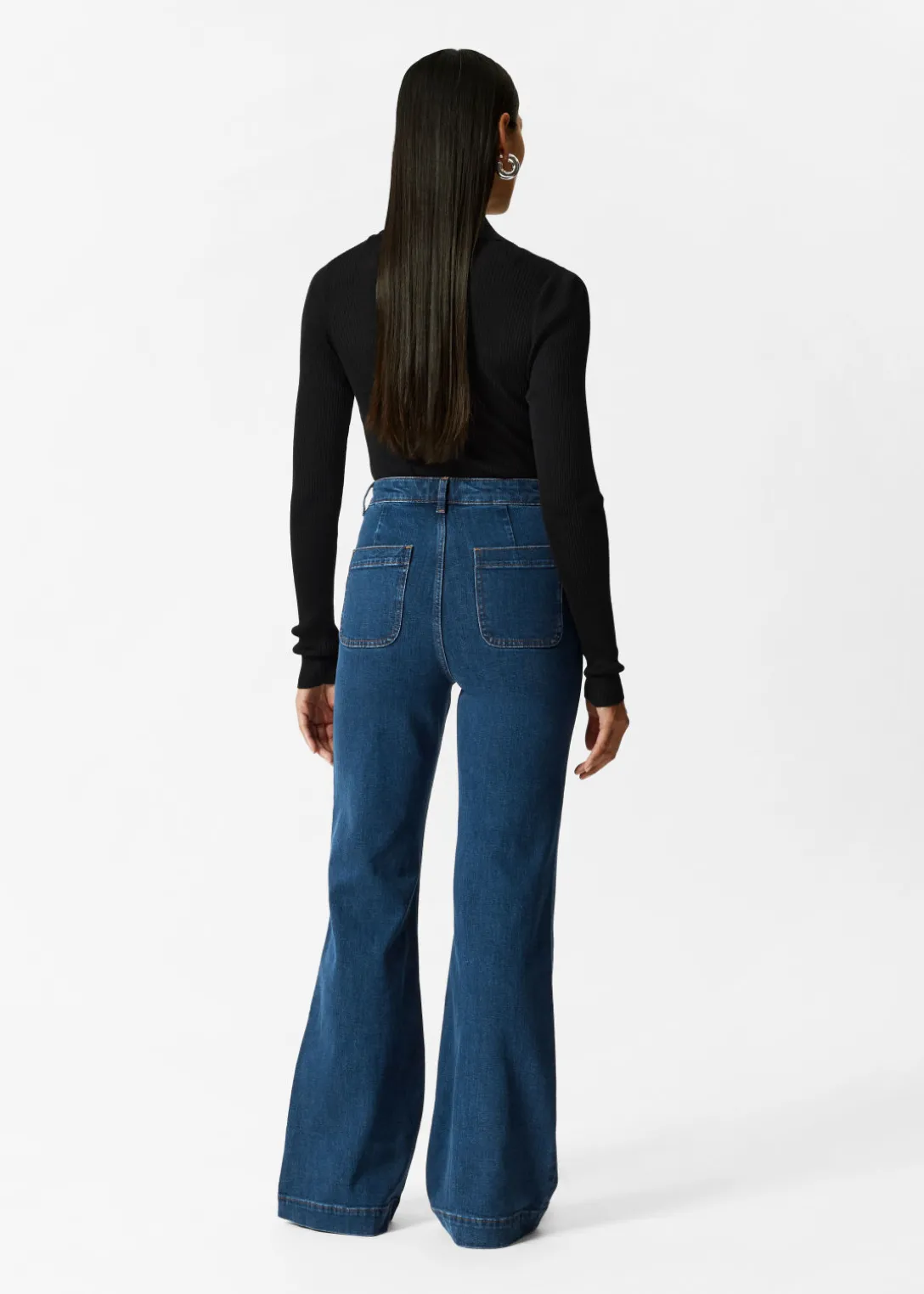 Jean taille haute à la silhouette évasée, agrémenté de deux poches plaquées à l’avant et à l’arrière.
