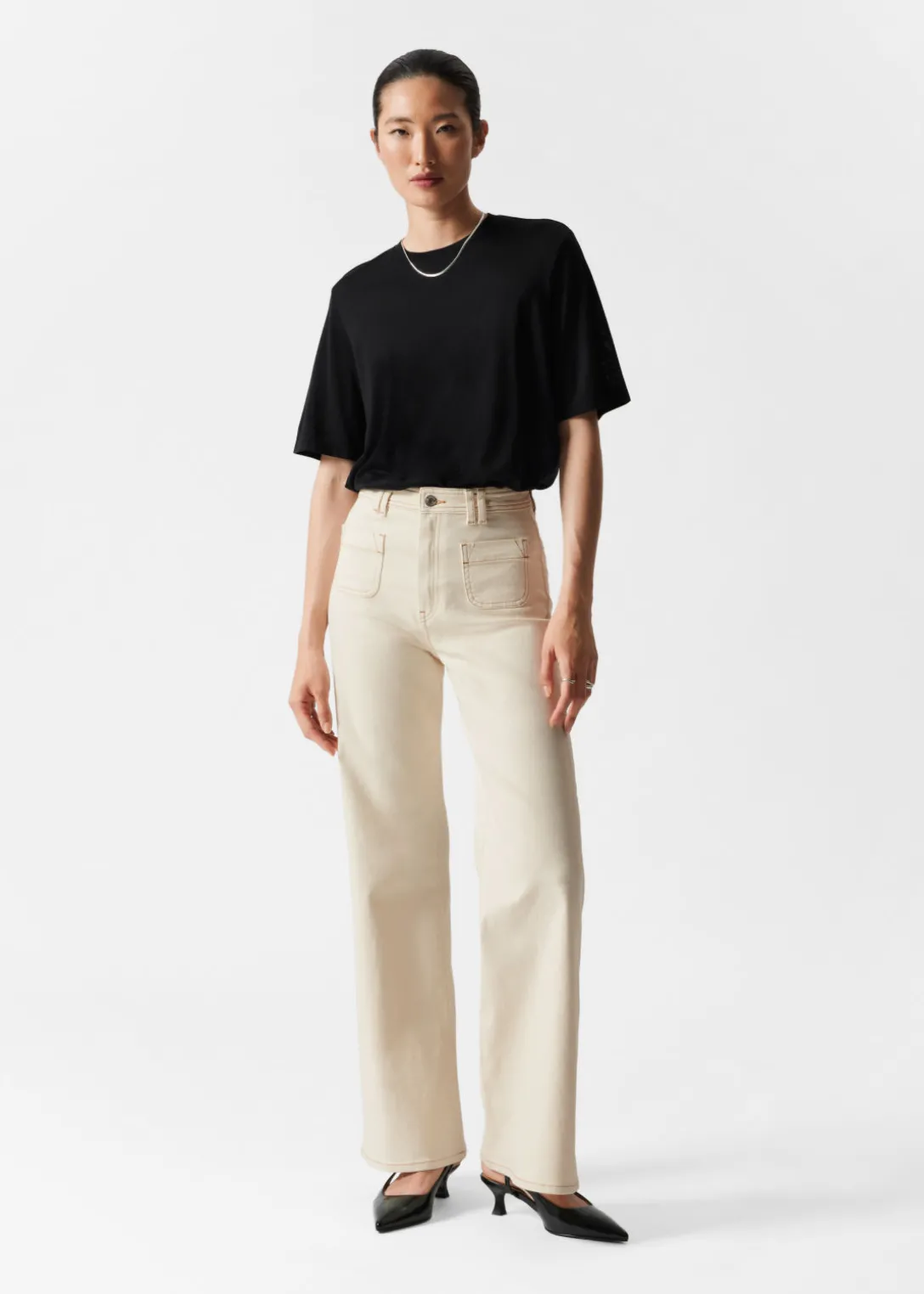 Jean bootcut taille haute détaillé avec poches plaquées à l’avant et à l’arrière.