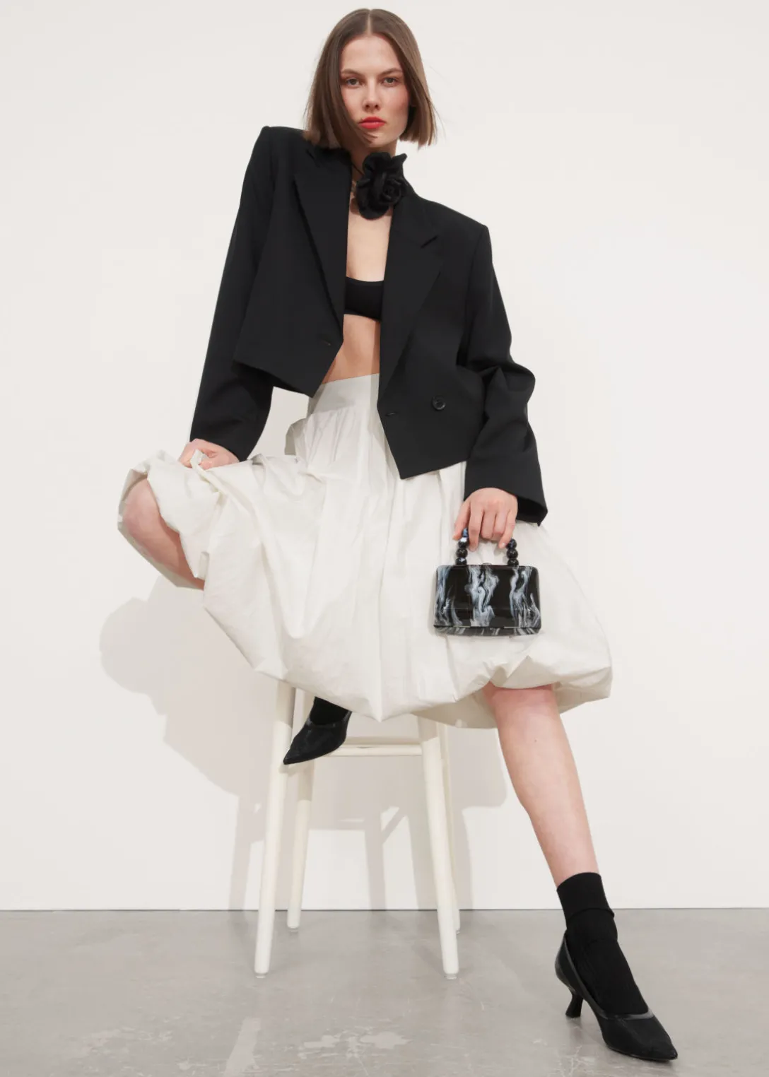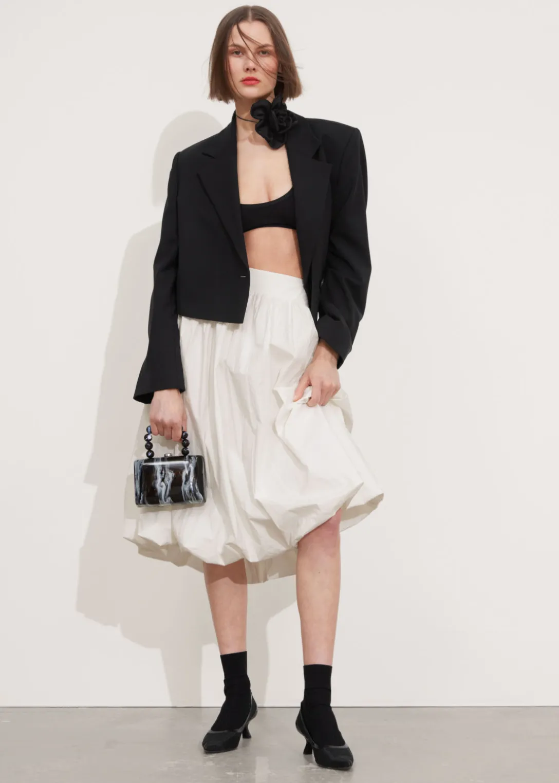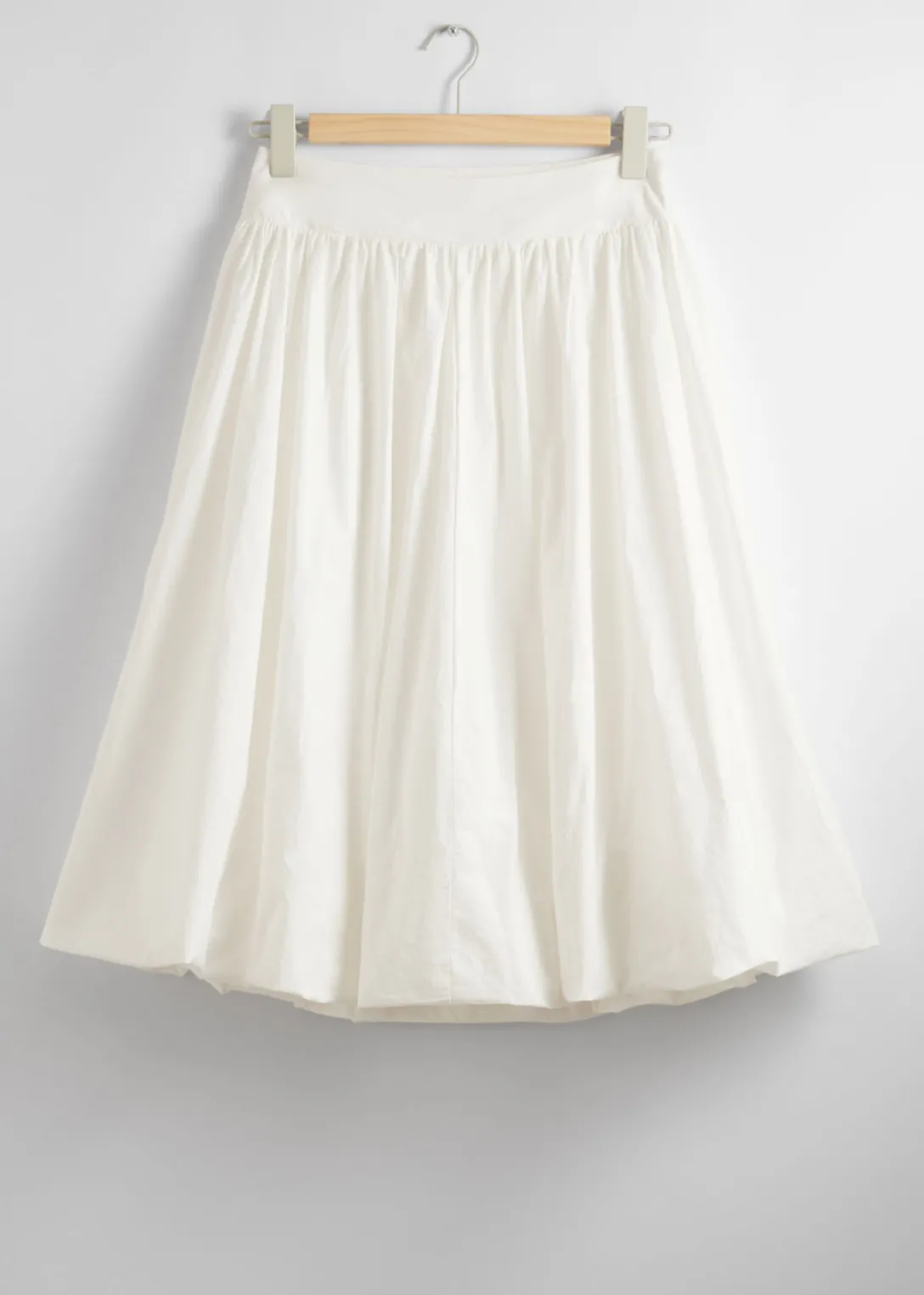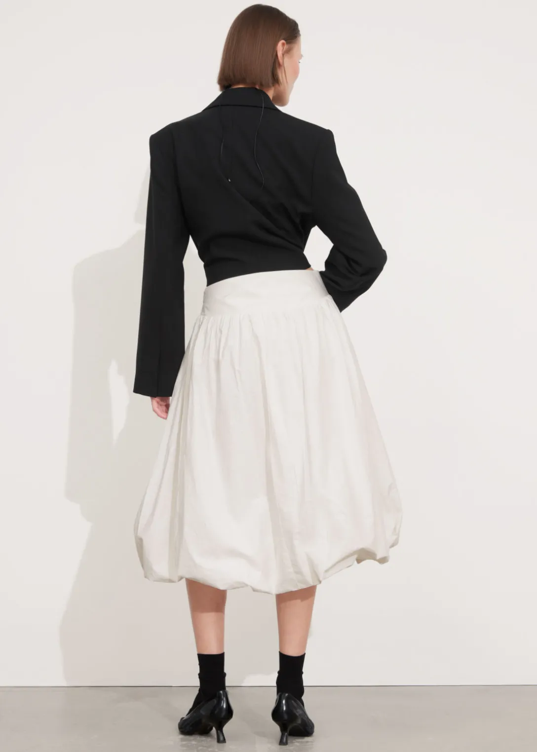 Jupe midi boule à taille haute avec une silhouette trapèze, créant plus de mouvement et de volume.