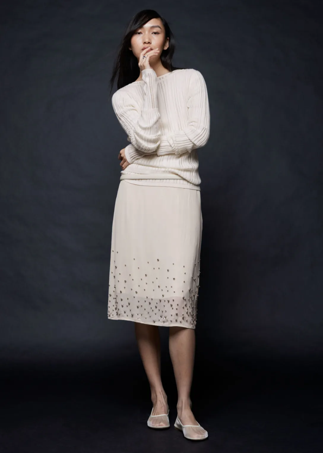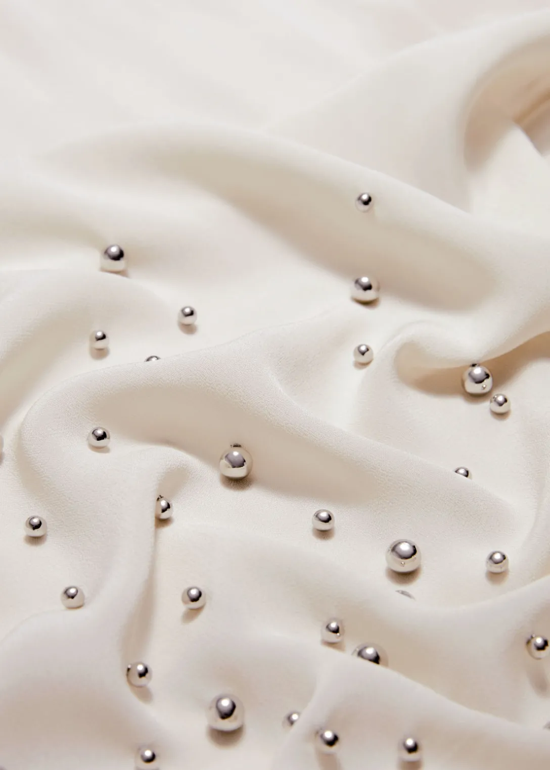 Jupe midi transparente, ornée de petits clous sphériques en métal.