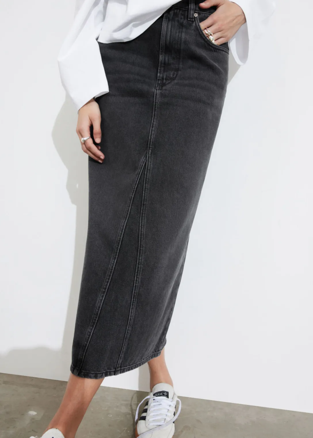 Jupe midi en jean avec 5 poches et une fente centrale à l’arrière.
