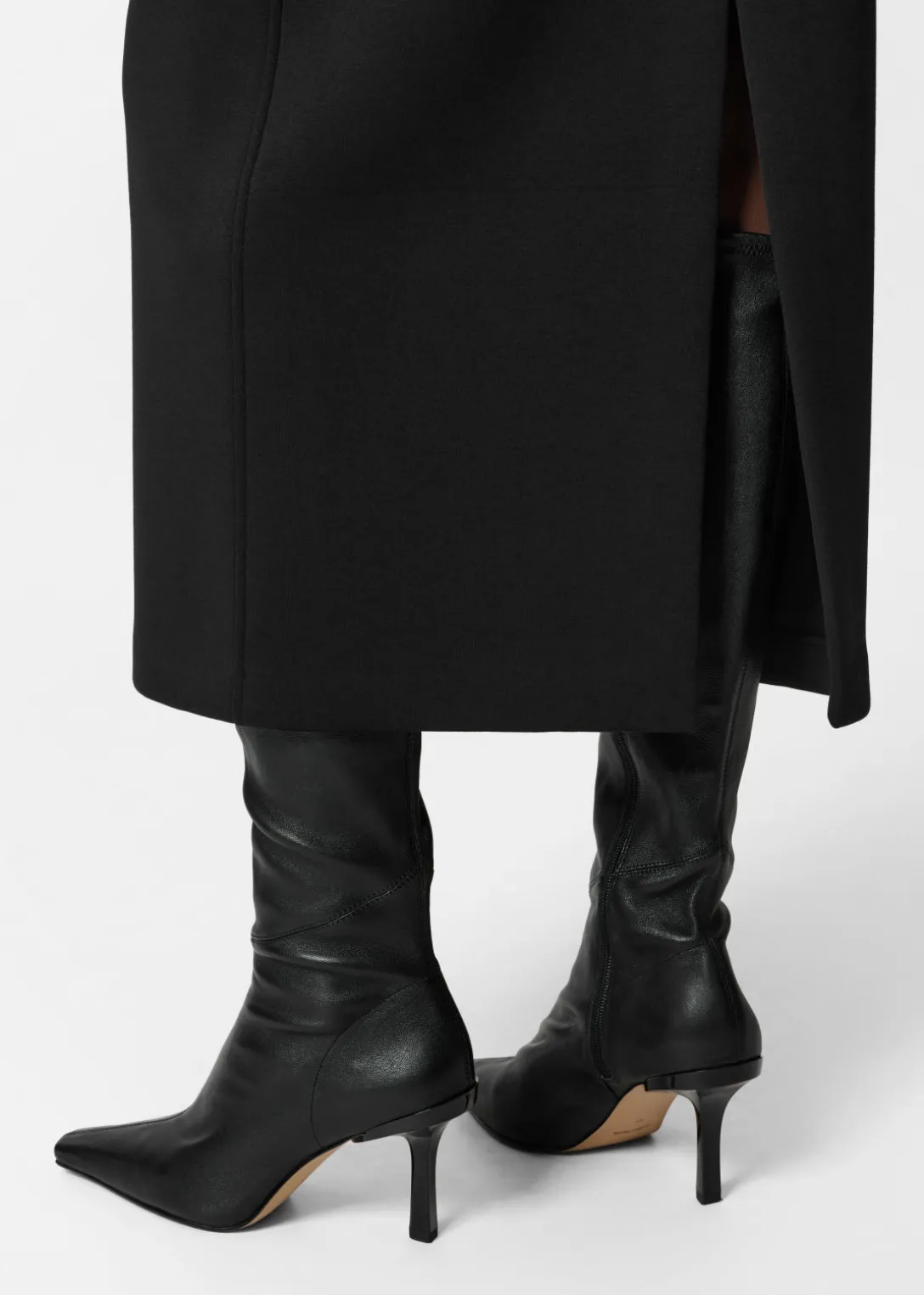 Jupe crayon midi à la finition en néoprène. Dotée d’une taille haute élastique et d’une fente centrale à l’arrière.