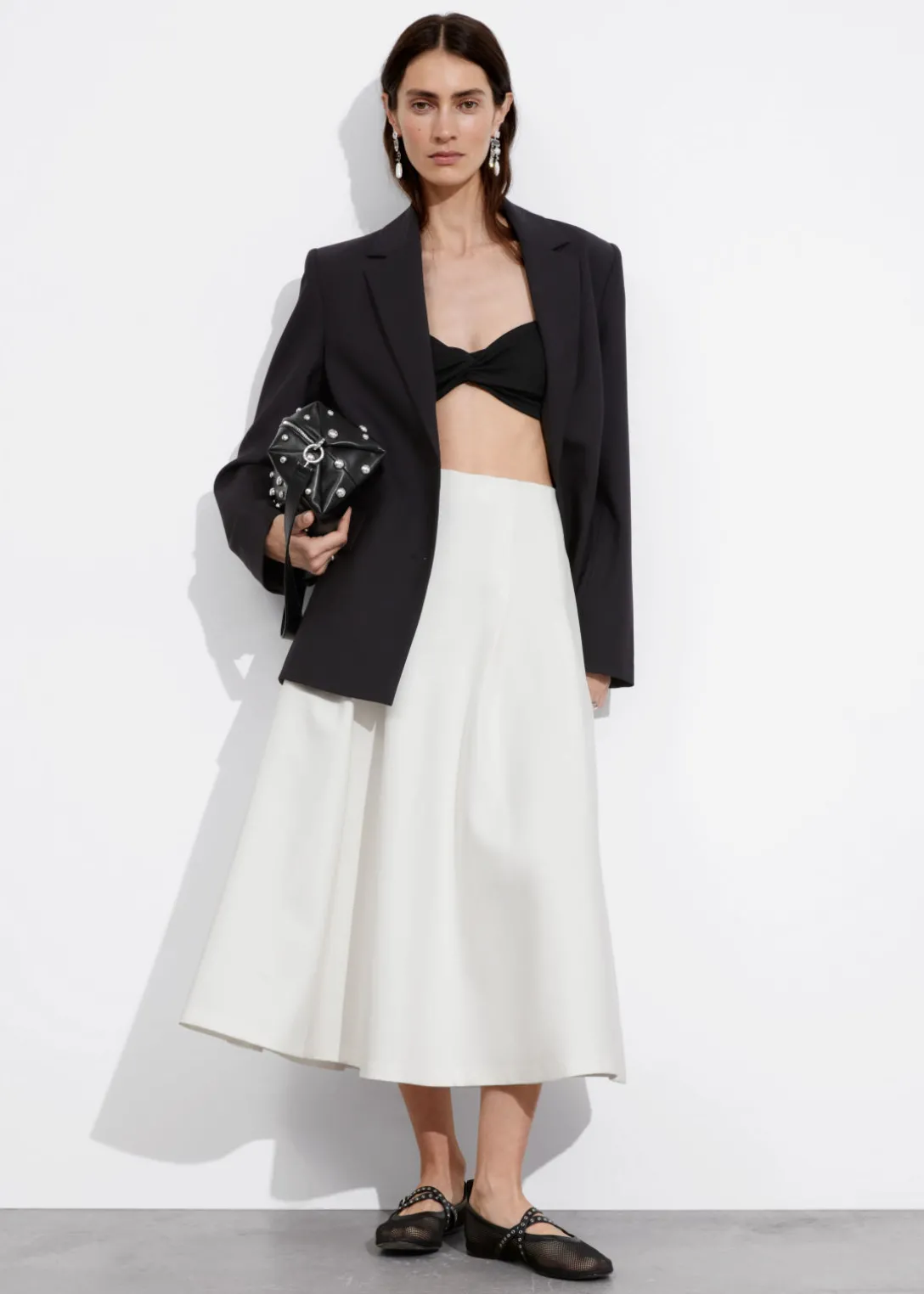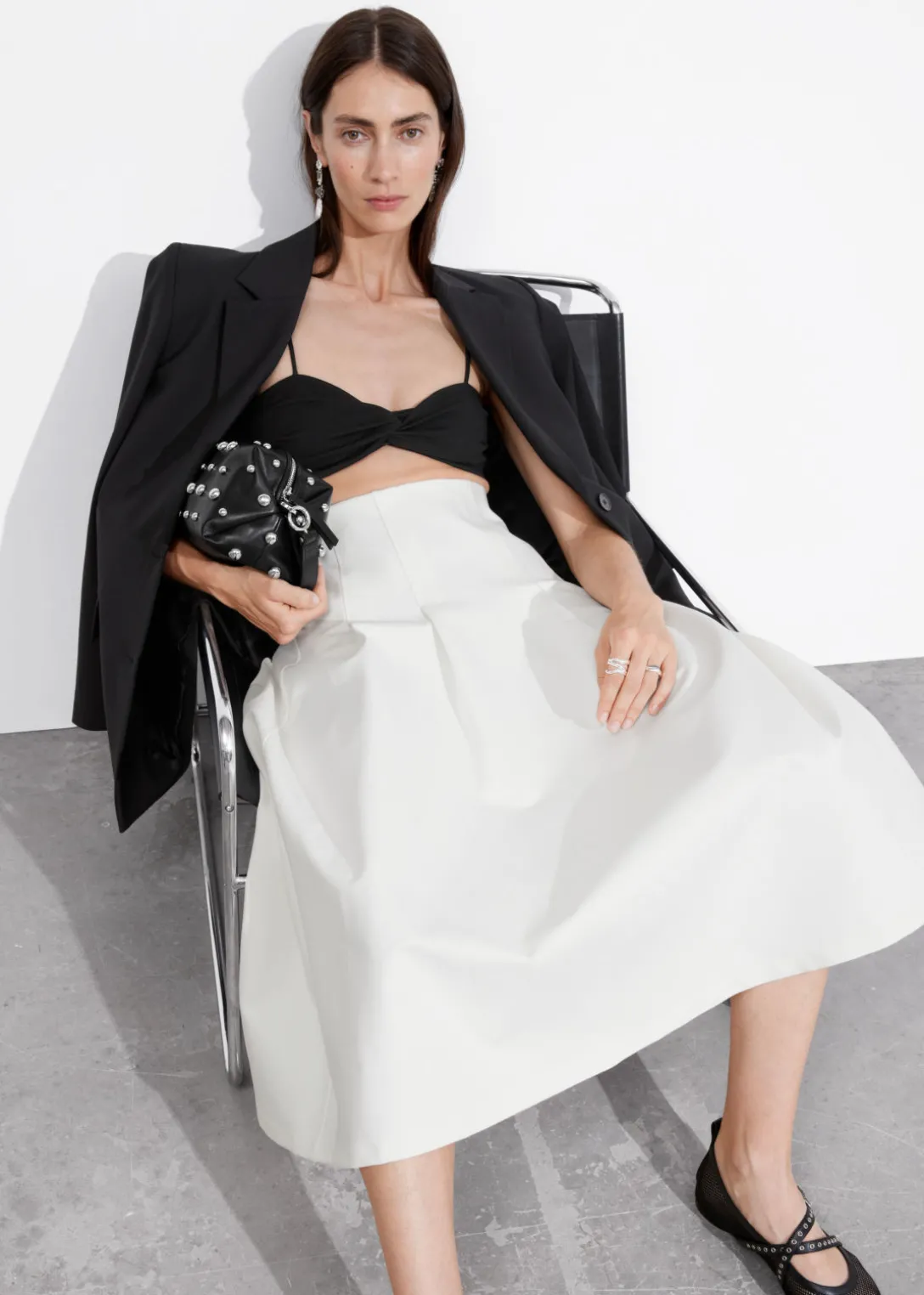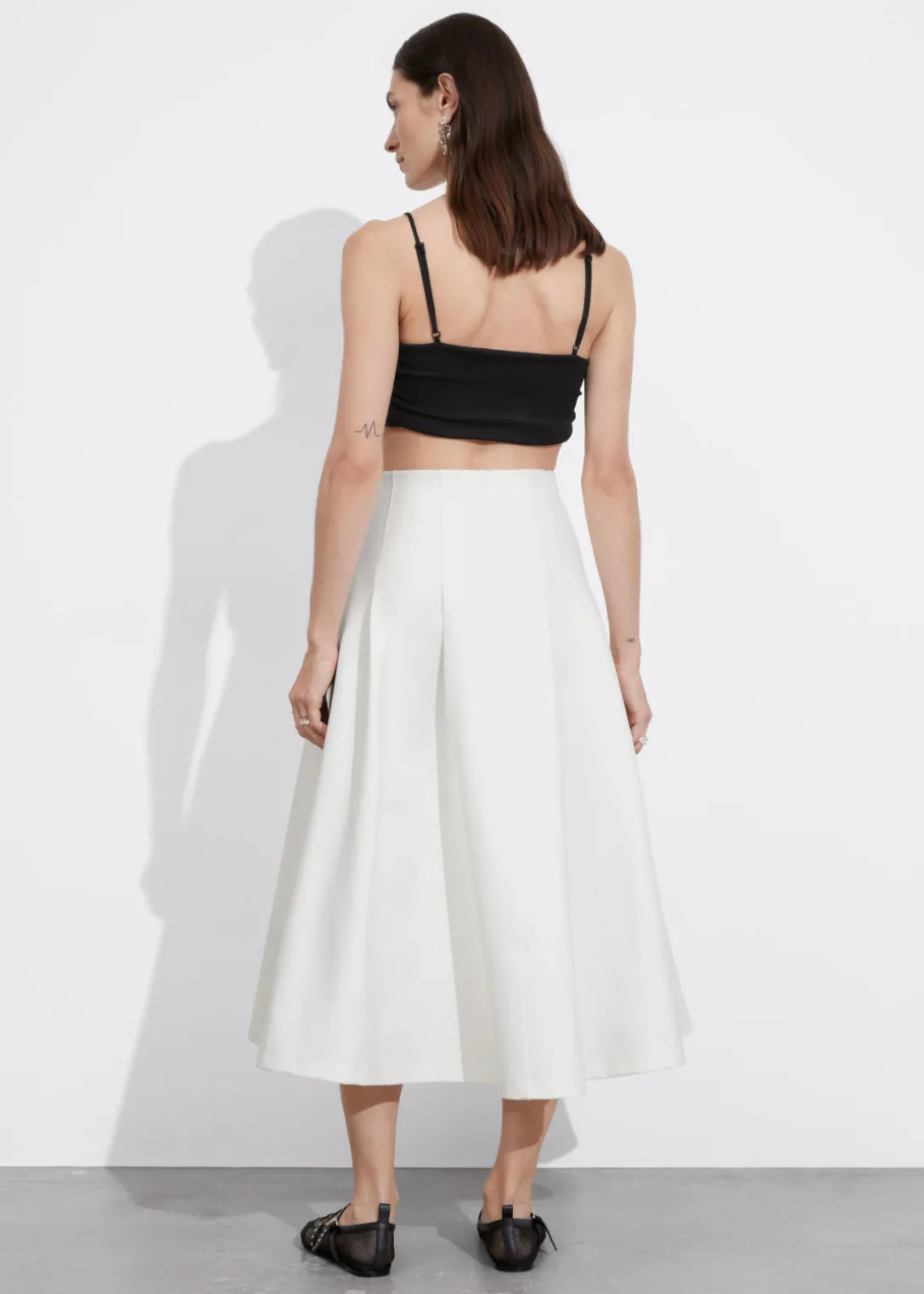Jupe midi trapèze avec une silhouette légèrement plissée. Dotée d’une taille élastiquée.