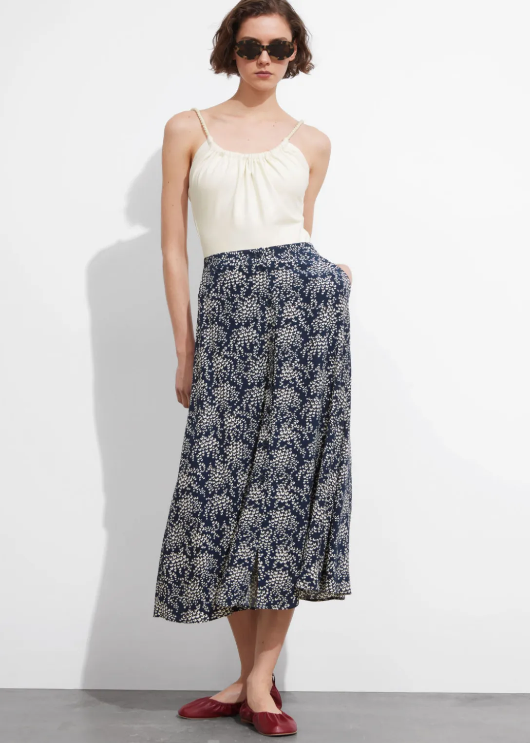 Jupe midi trapèze à taille haute, avec une fermeture boutonnée à l’avant et une taille élastique.
