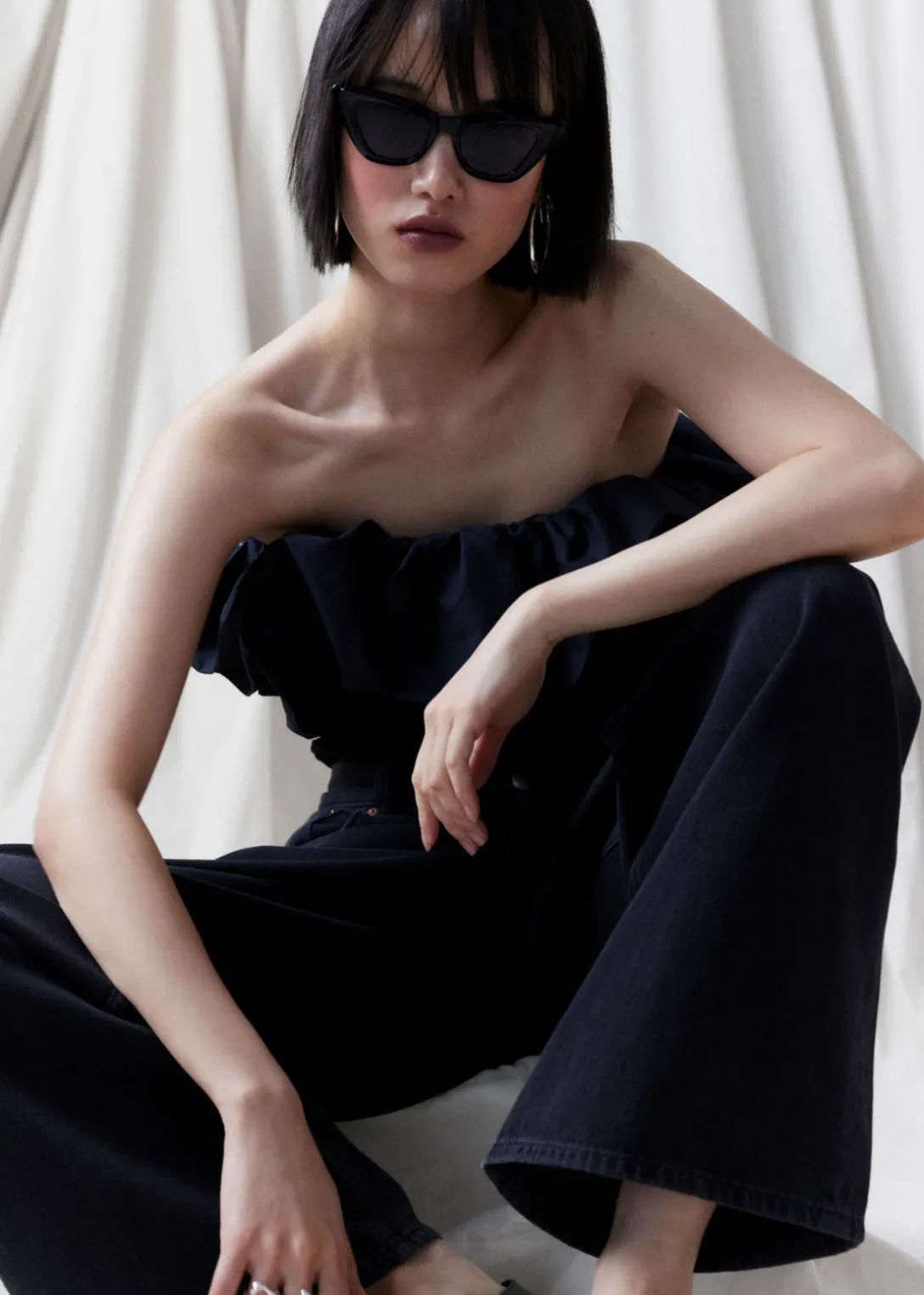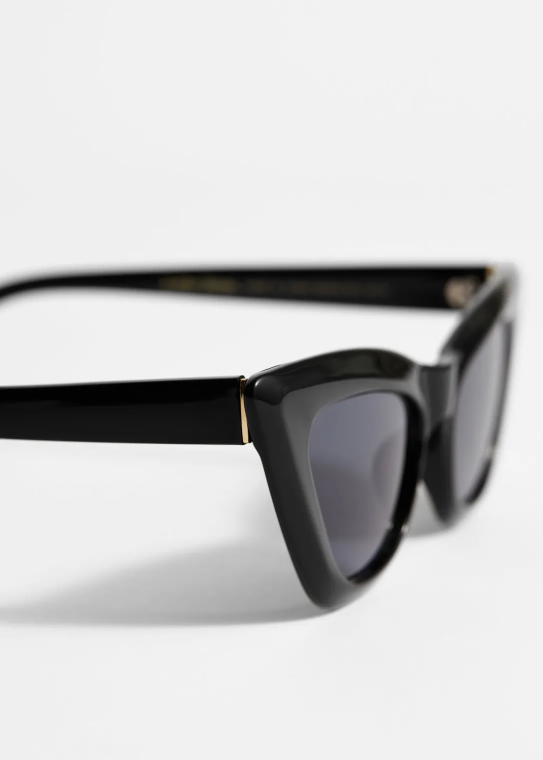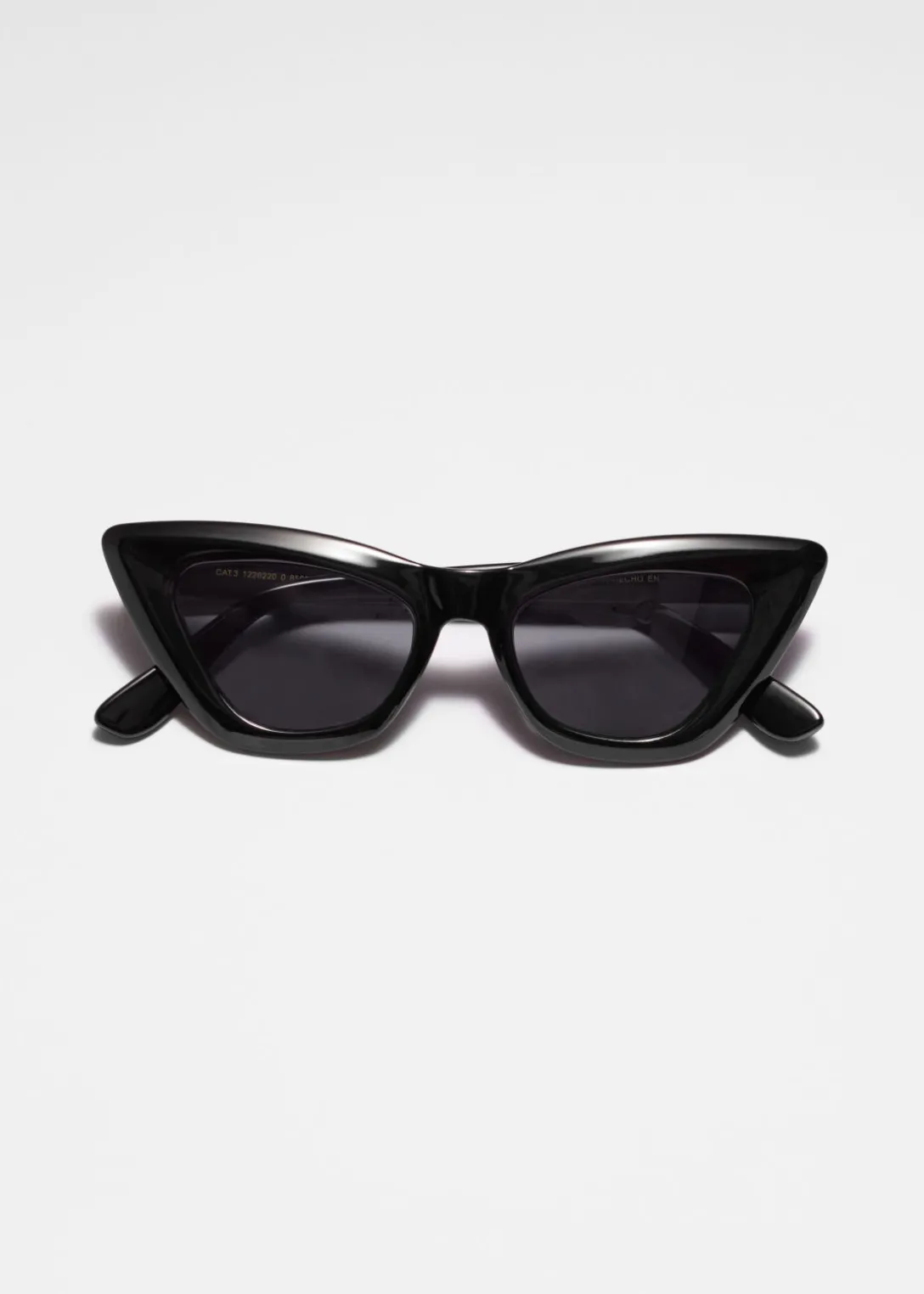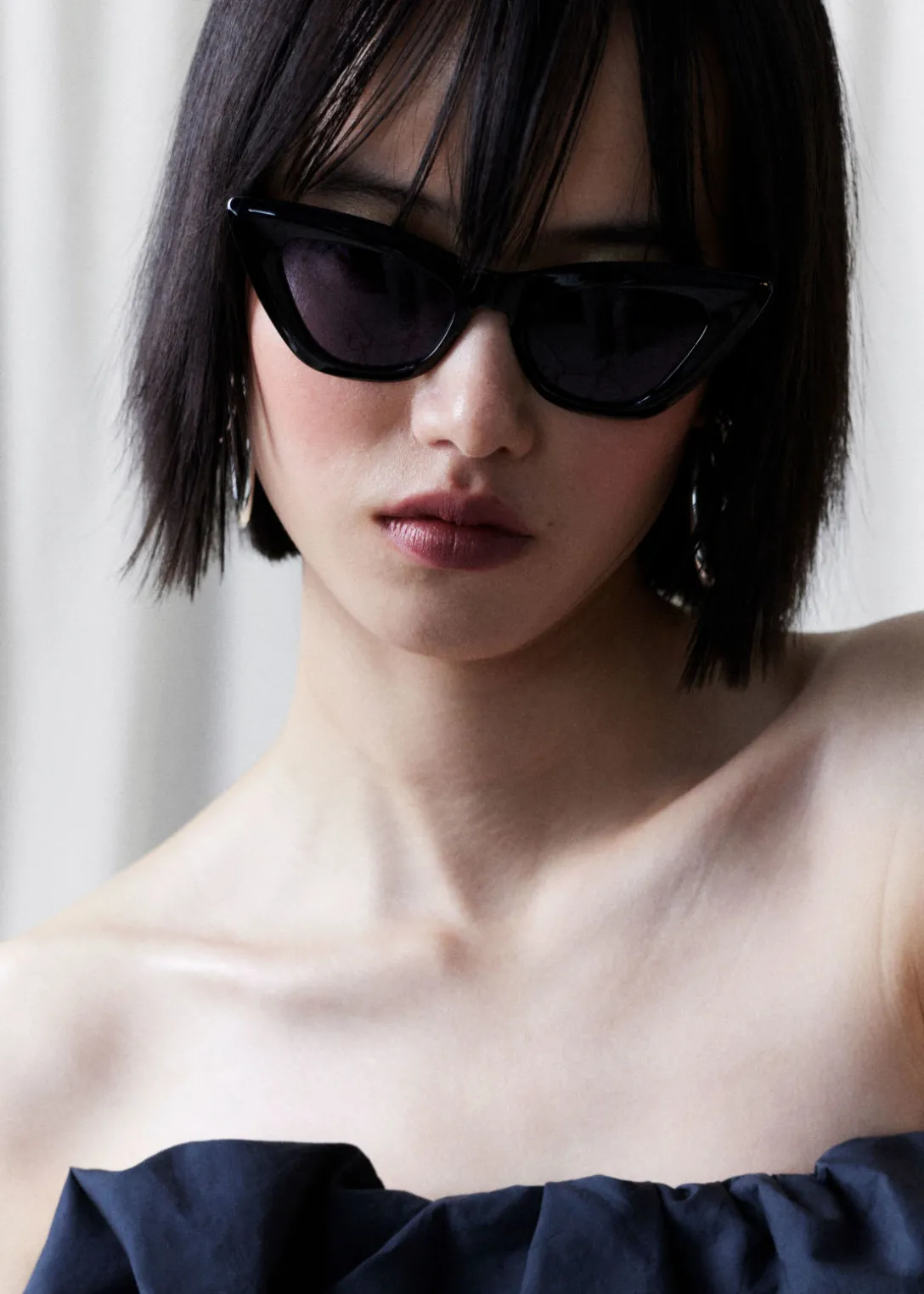 Les lunettes de soleil œil de chat sont un classique immuable. Elles possèdent des verres noirs assortis à la monture angulaire brillante.