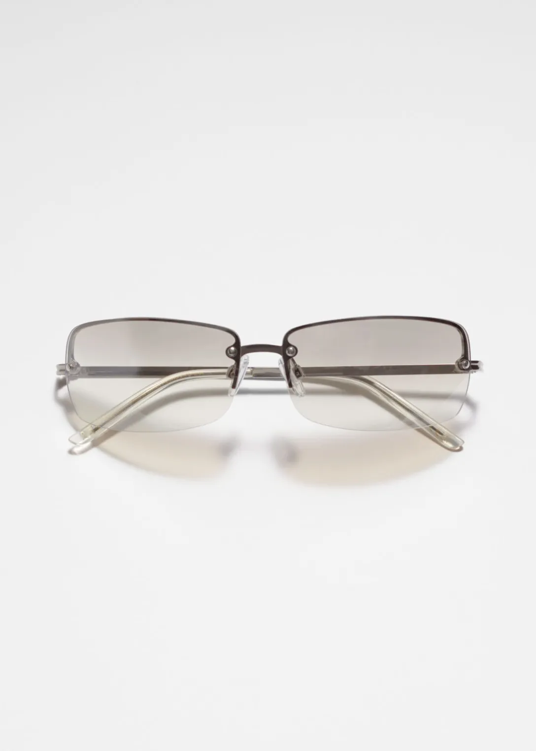 Ces lunettes de soleil se caractérisent par leurs verres dégradés sans monture. Confectionnées en métal doré, elles présentent une forme rectangulaire rappelant les modèles populaires des années 90.
