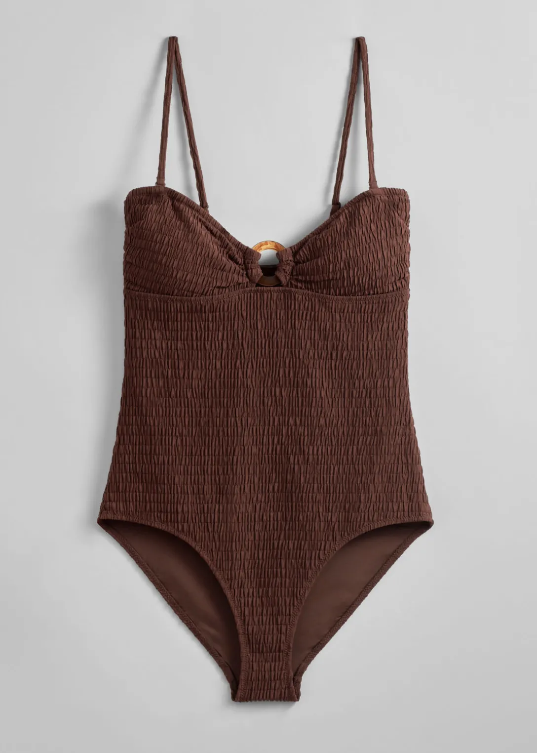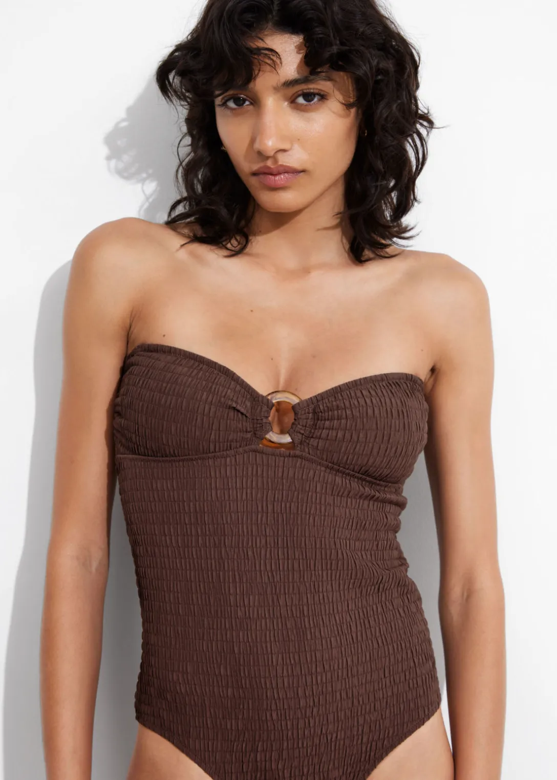 Maillot de bain à encolure bandeau, avec une finition à smocks et un anneau à motif écaille de tortue au centre.