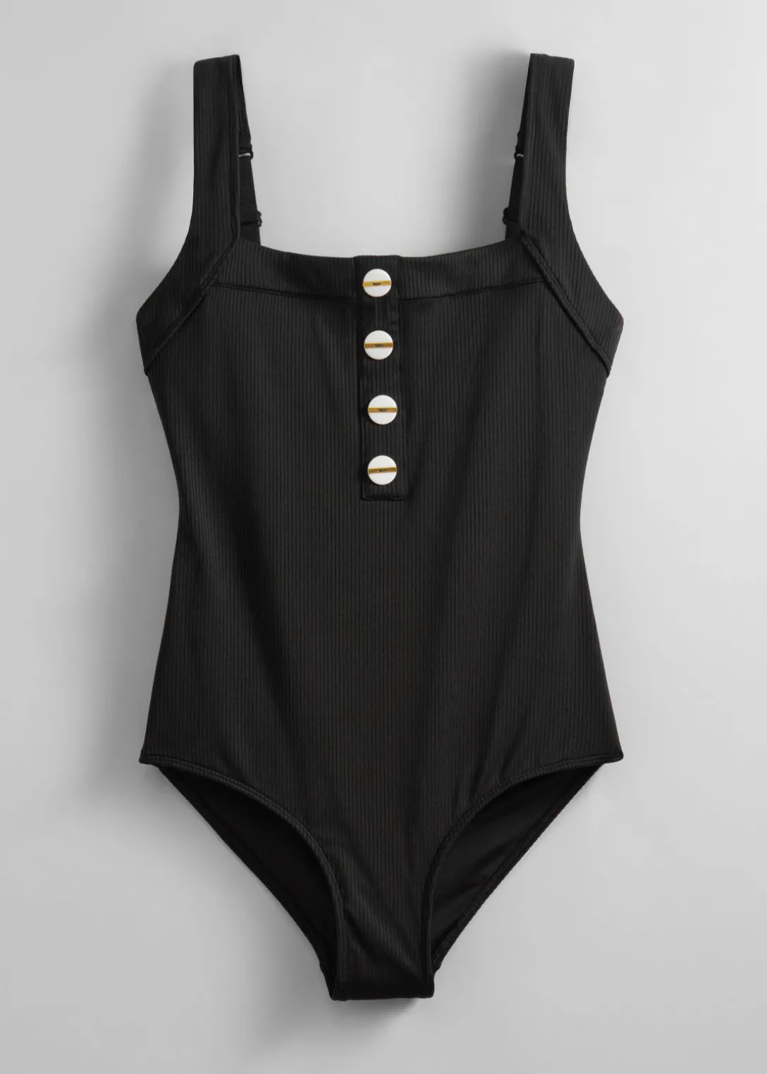 Maillot de bain côtelé, orné de 5 boutons décoratifs.