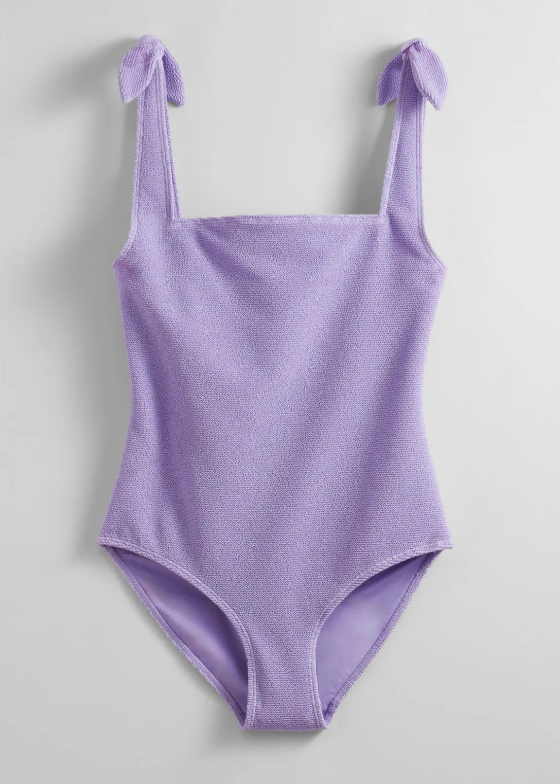 Maillot de bain une pièce texturé avec des nœuds décoratifs aux épaules et une encolure carrée.