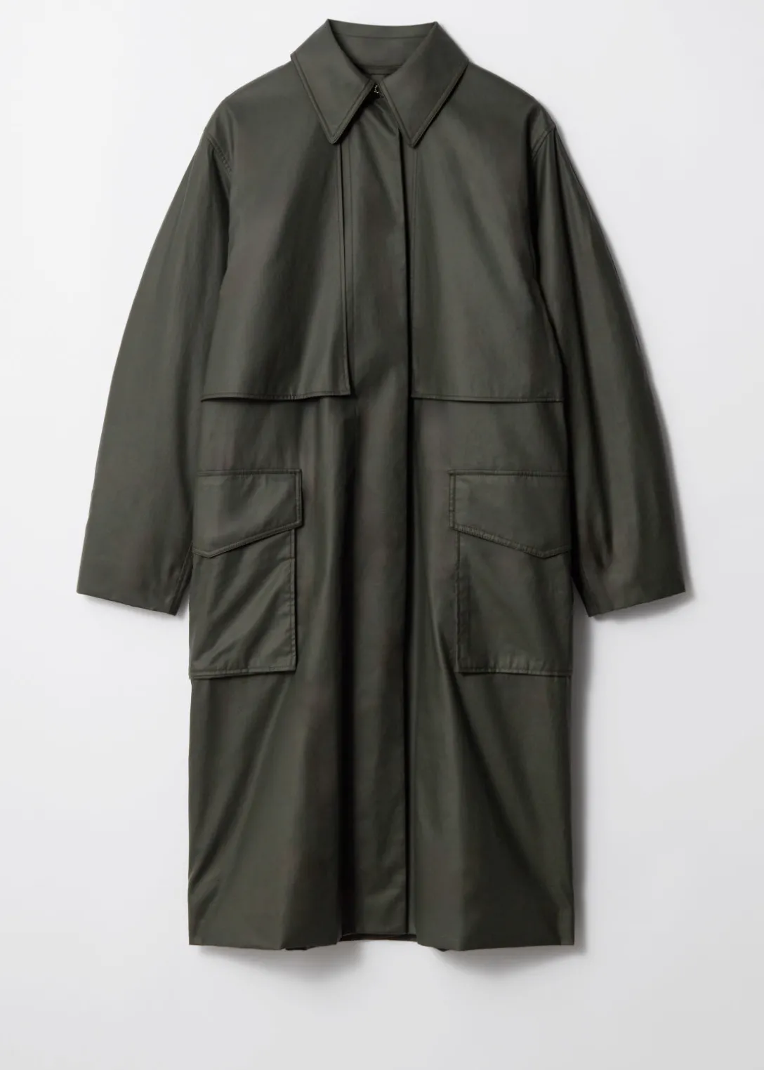 Manteau en coton, avec des manches longues et deux grandes poches plaquées à rabat.