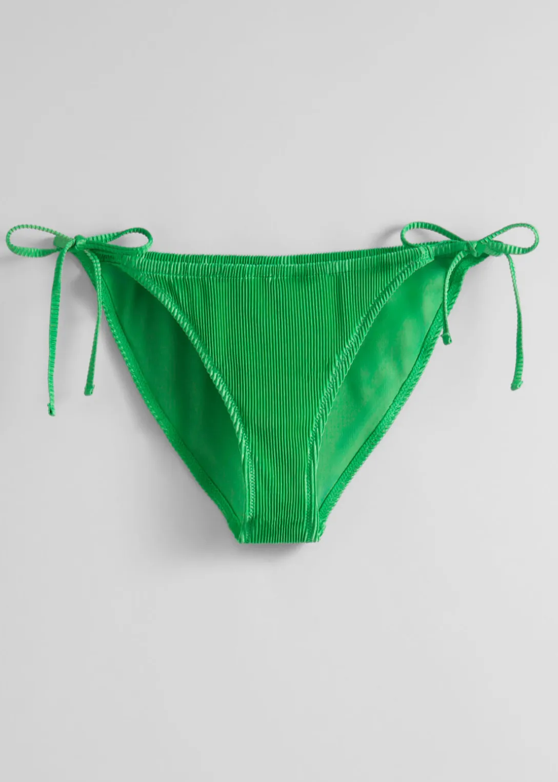 Mini bas de bikini plissé avec des liens de chaque côté pour un meilleur ajustement.