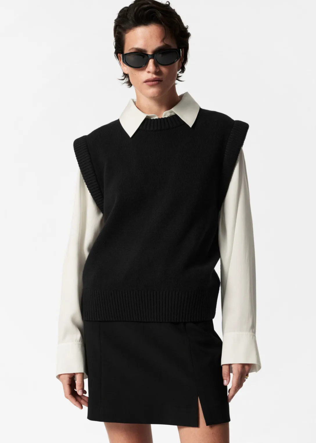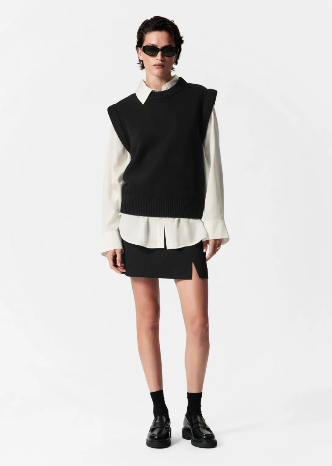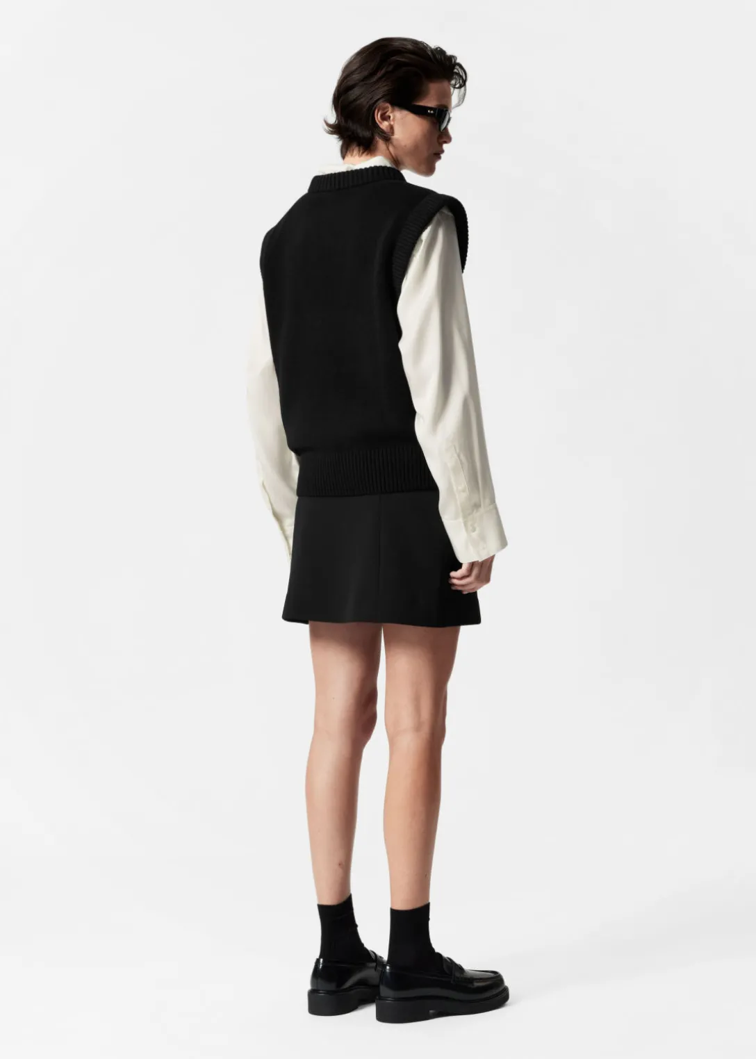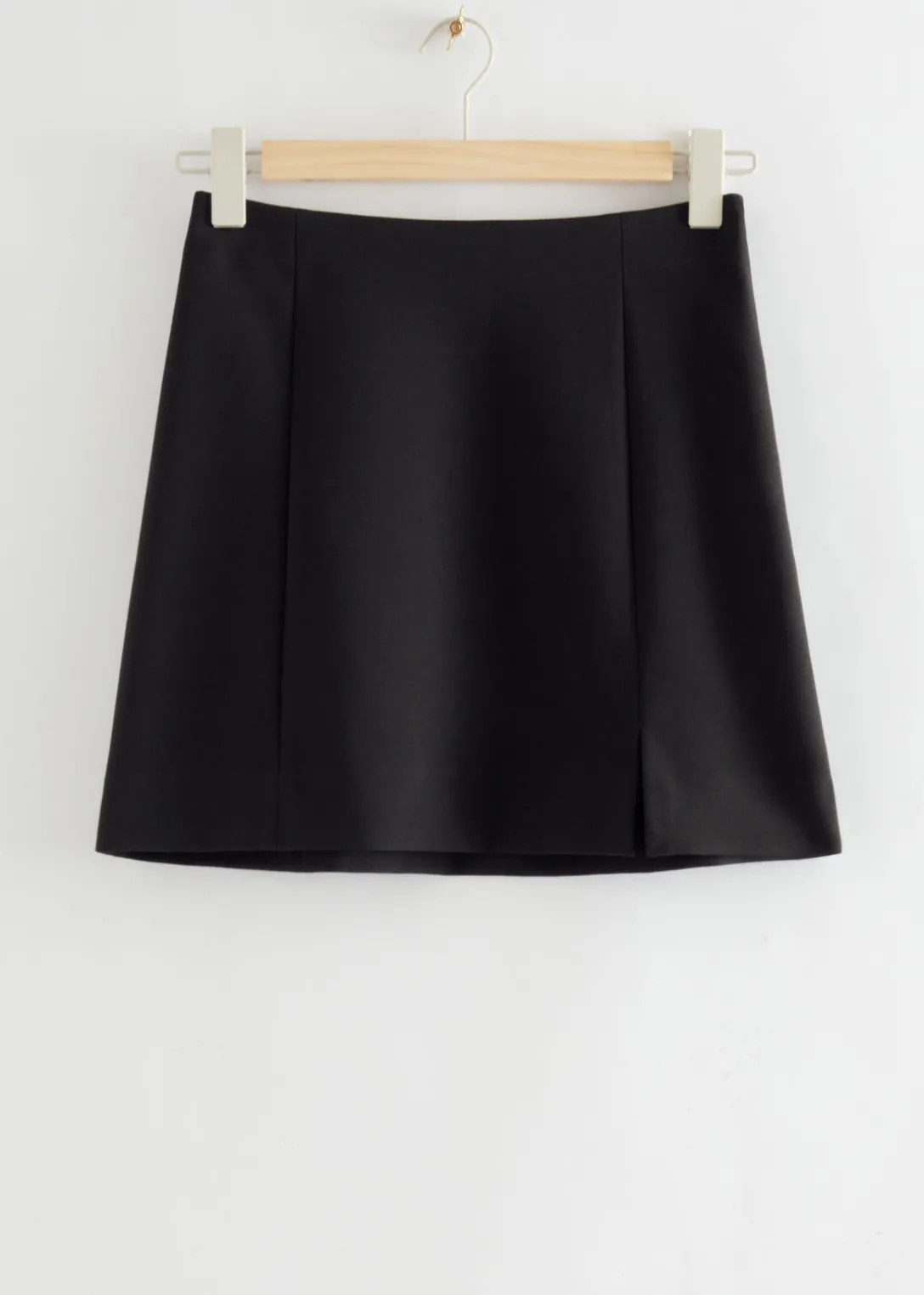 Mini-jupe trapèze style années 90 ornée de découpes et d’une fente.
