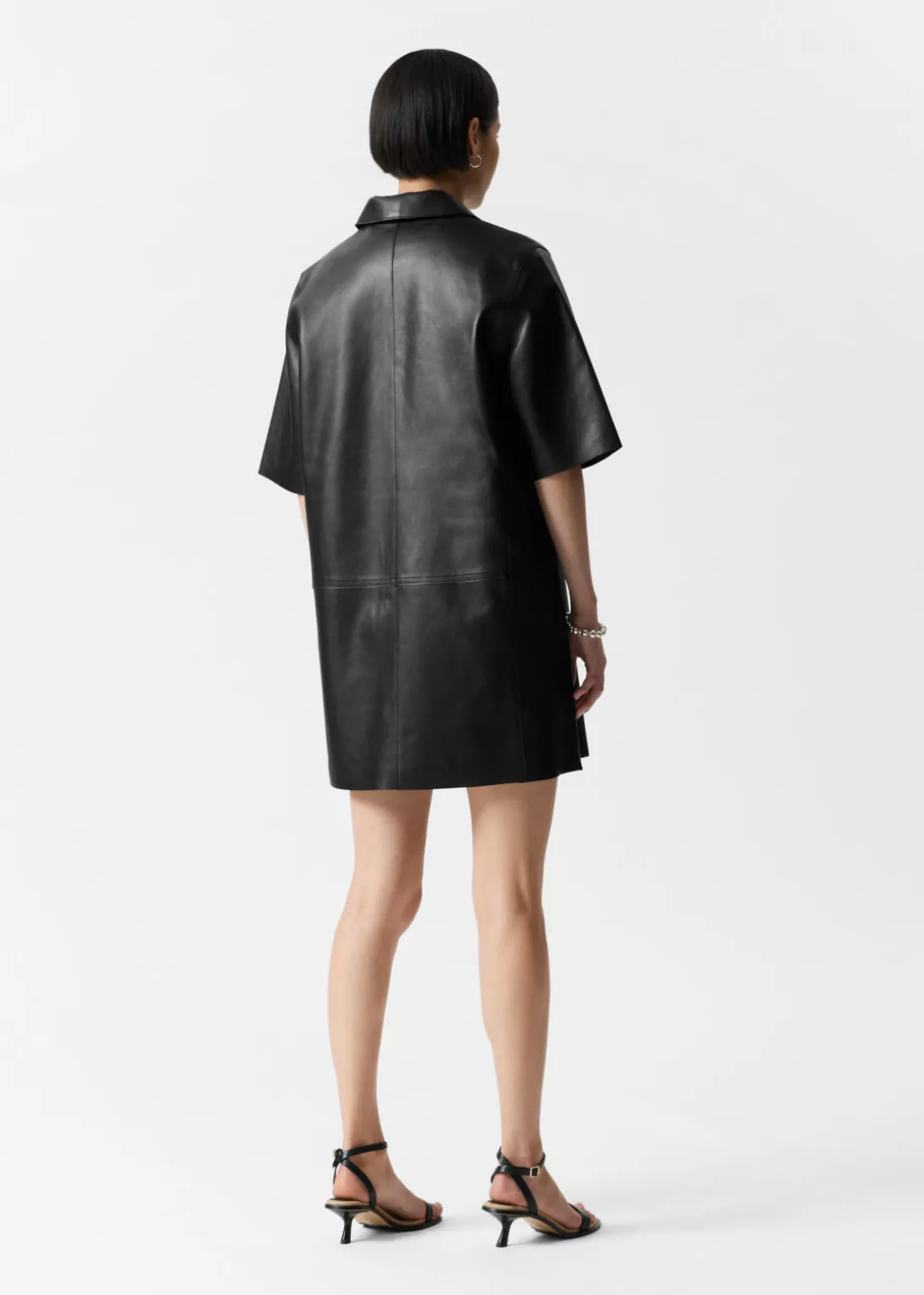 Robe en cuir à manches courtes dans une finition lisse. Dotée d’une fermeture éclair centrale sur le devant.