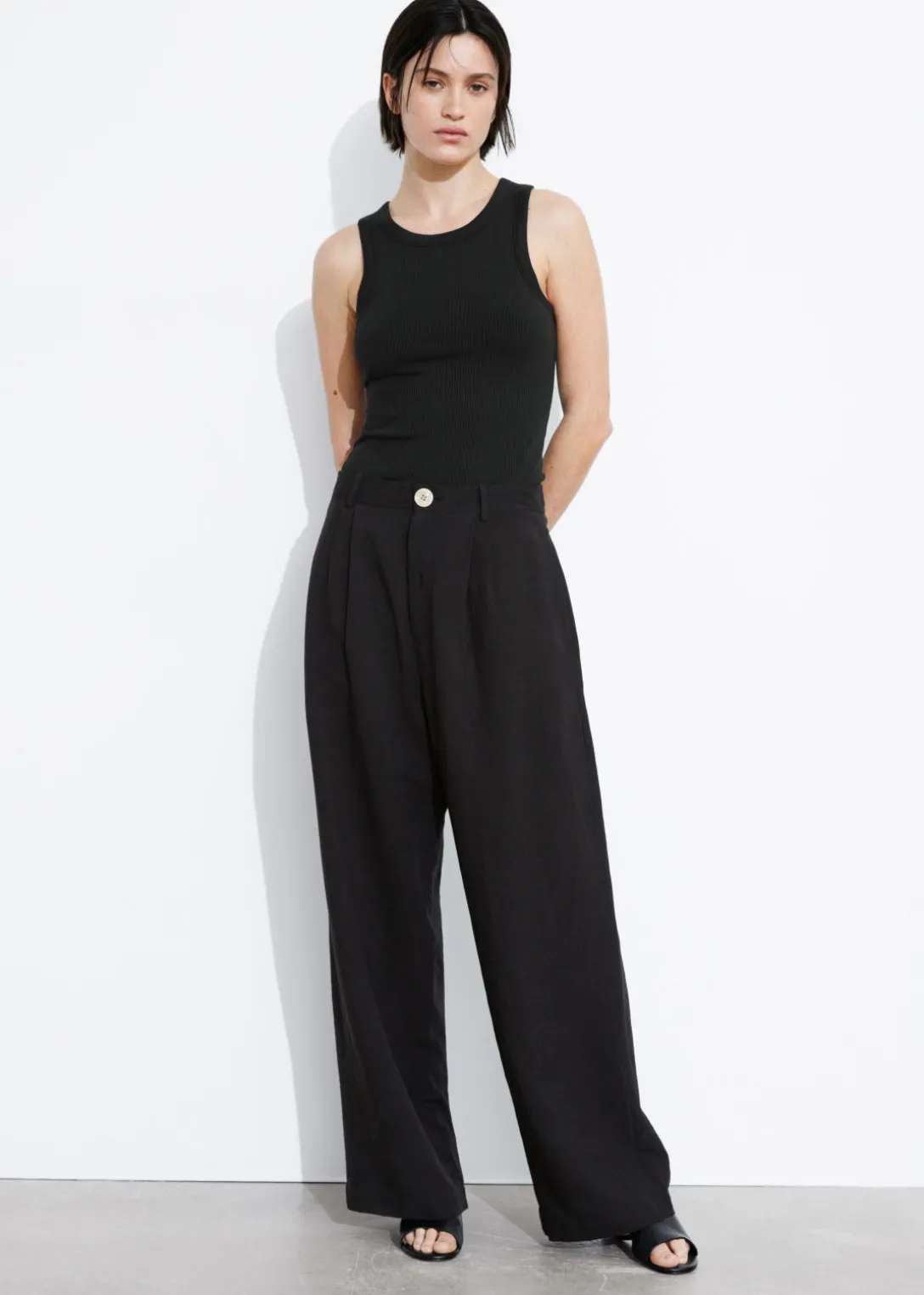 Pantalon taille haute, confectionné à partir d’une matière légère et aérienne. Doté d’une silhouette décontractée.