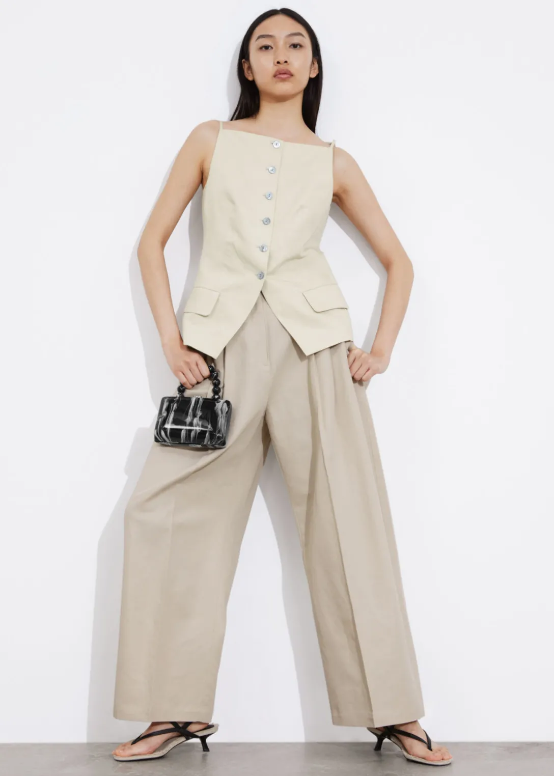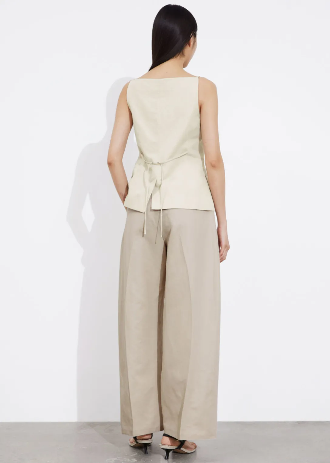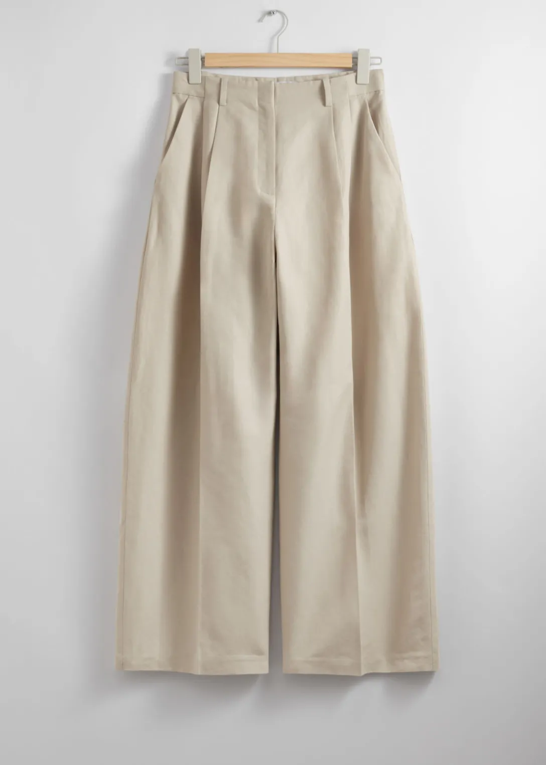 Pantalon habillé à taille haute confectionné à partir d’une matière aérienne. Doté d’une silhouette large avec des détails plissés.