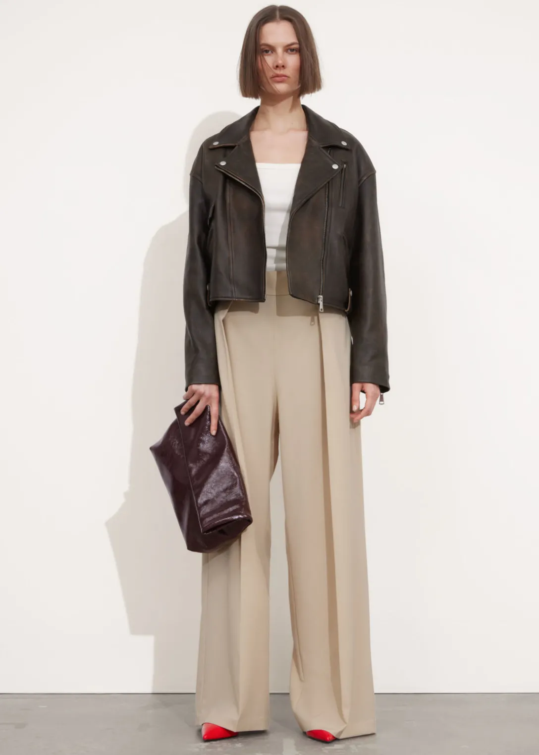 Pantalon large à taille haute, avec des plis au centre à l’avant et deux poches prises dans les coutures latérales.
