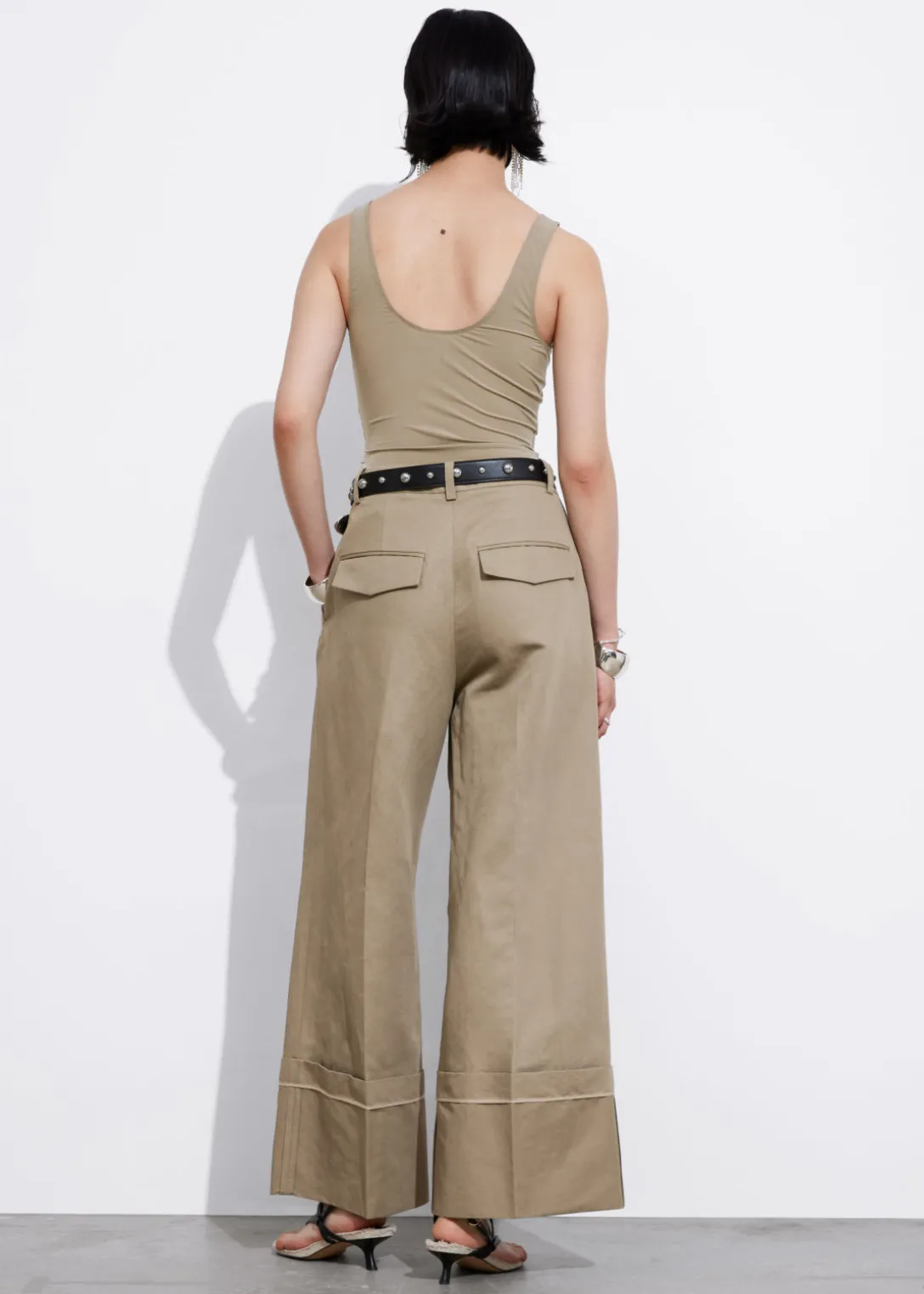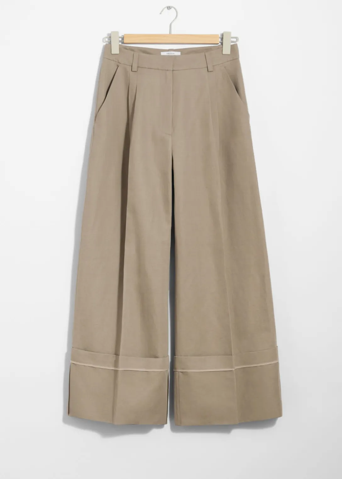 Pantalon large habillé à taille haute, avec des plis marqués et des revers repliés.