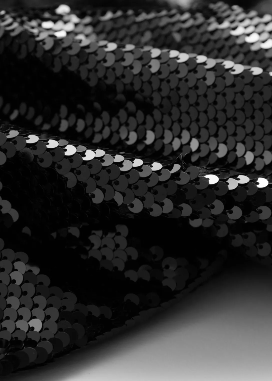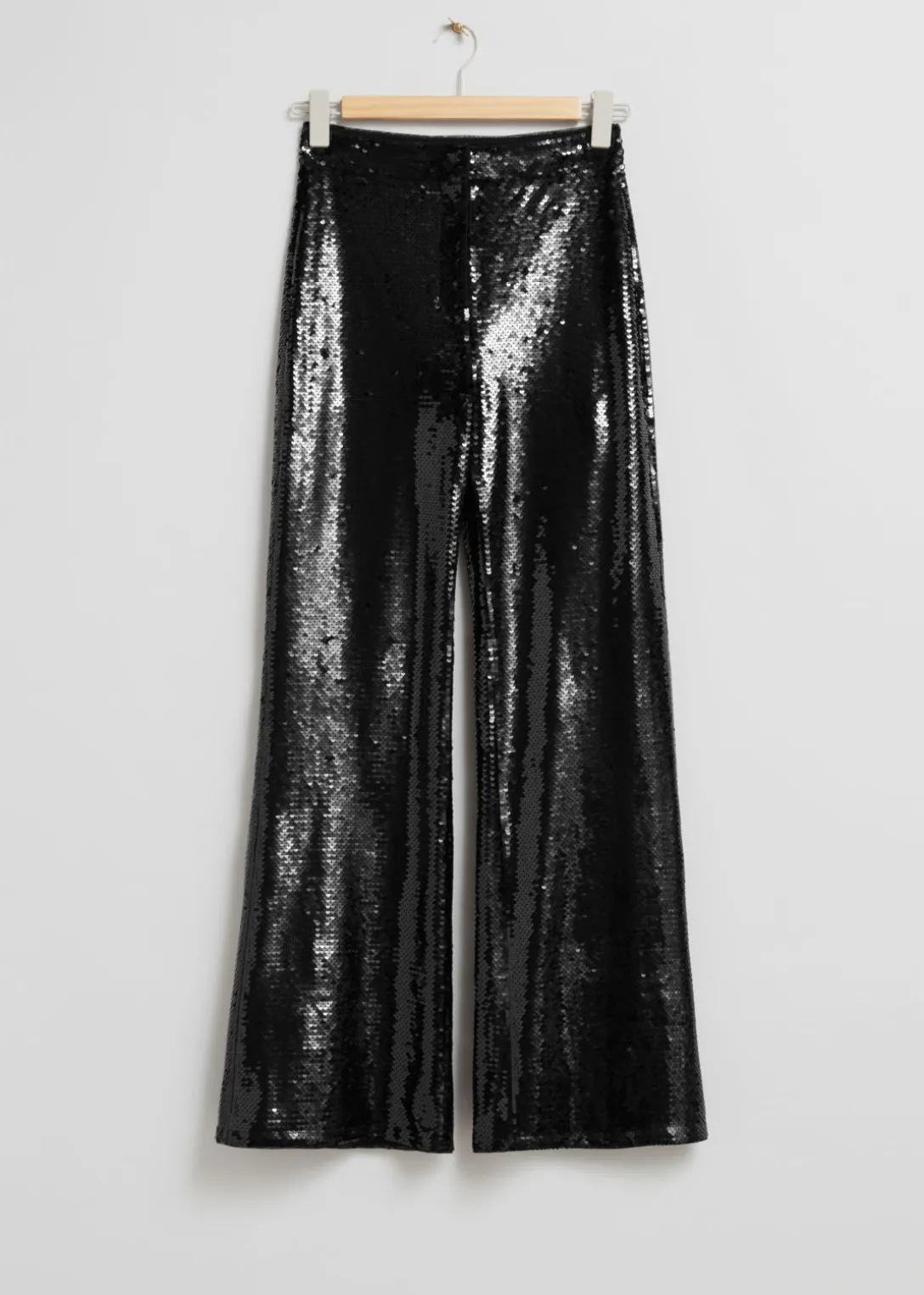 Pantalon slim orné d’une finition pailletée. Braguette zippée et fermeture à agrafe.