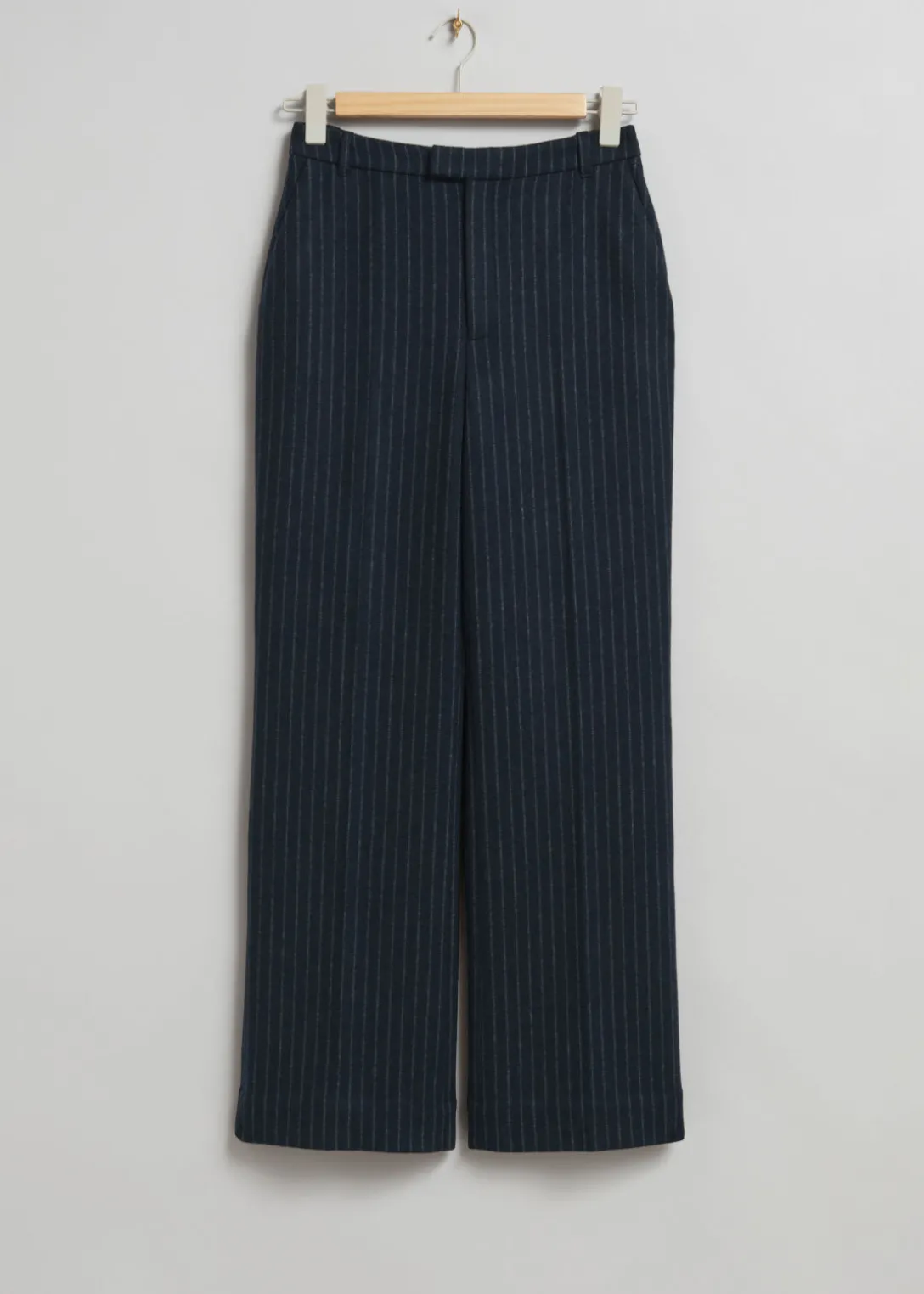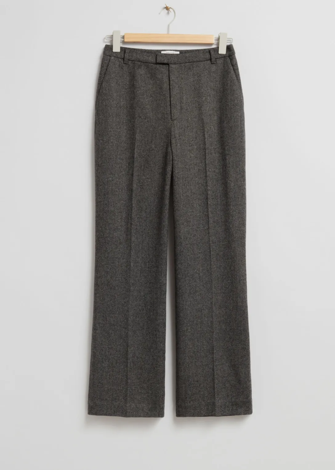 Pantalon slim habillé en laine mélangée, avec des plis marqués et un ourlet évasé.