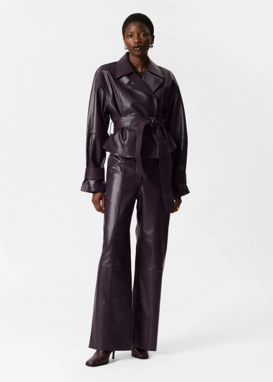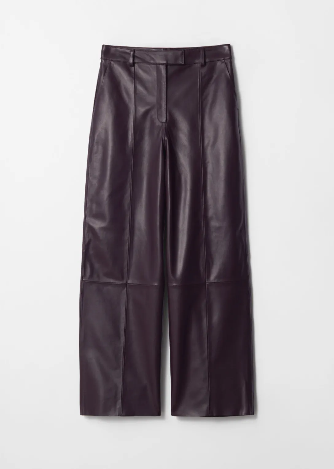 Pantalon droit en cuir, avec deux poches italiennes latérales et deux poches passepoilées à l’arrière.