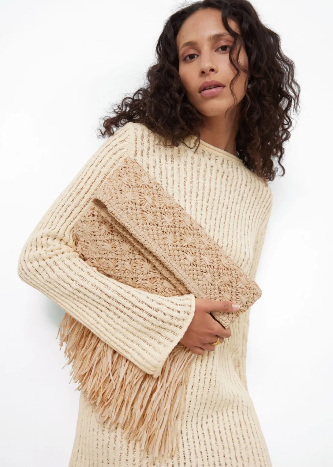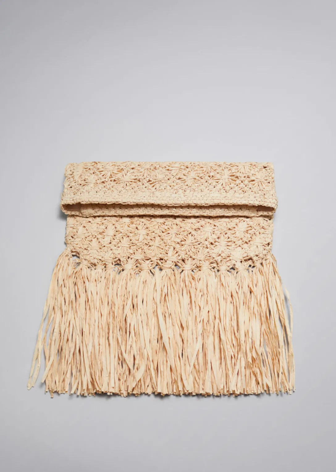 Tissé en paille beige et garni de franges ondulantes. Ce sac est conçu avec une bandoulière en chaîne dorée en option, pour que vous puissiez avoir les mains libres. L’intérieur doublé de coton contient une poche plaquée et il y a suffisamment d’espace pour vos clés, vos cartes et votre rouge à lèvres.