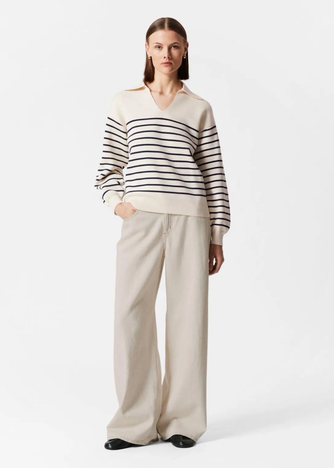 Pull à col décontracté, confectionné en maille de coton mélangé. Doté d’un col rabattu, de manches longues et de poignets et d’un ourlet côtelés, silhouette décontractée.