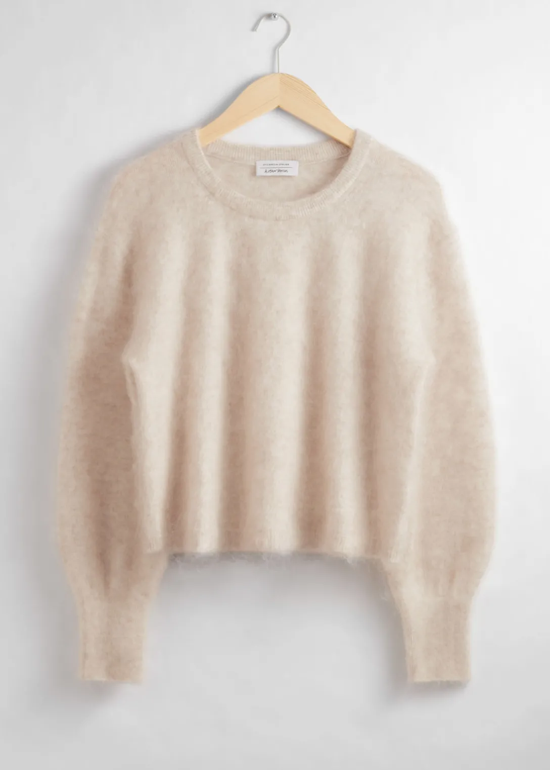 Pull peluché confectionné à partir d’un mélange de laine et de mohair. Doté d’une encolure, de poignets et d’ourlet côtelés.