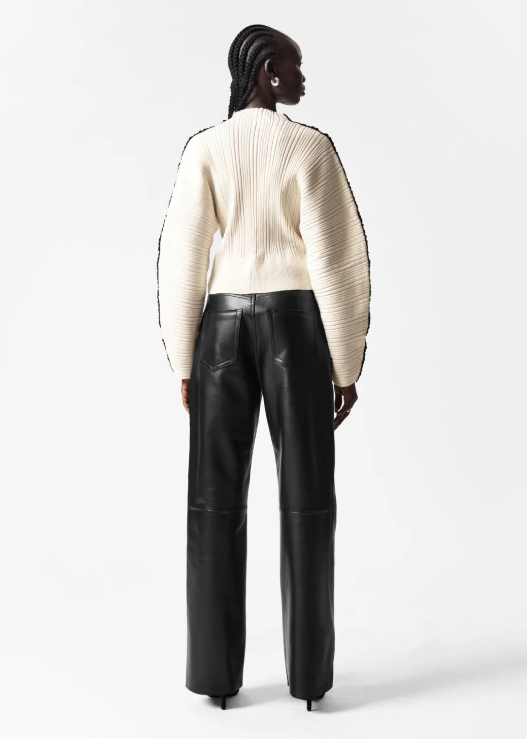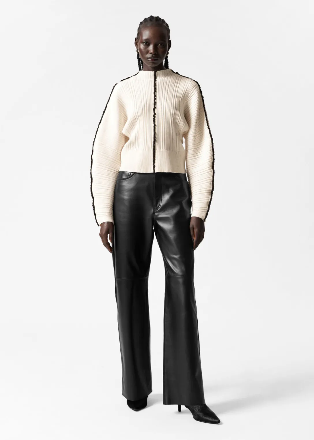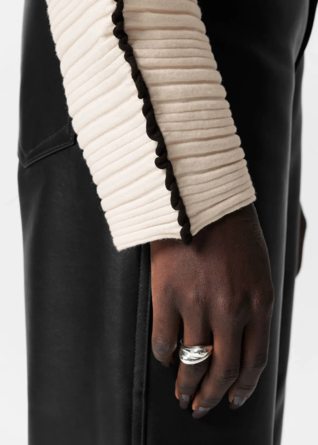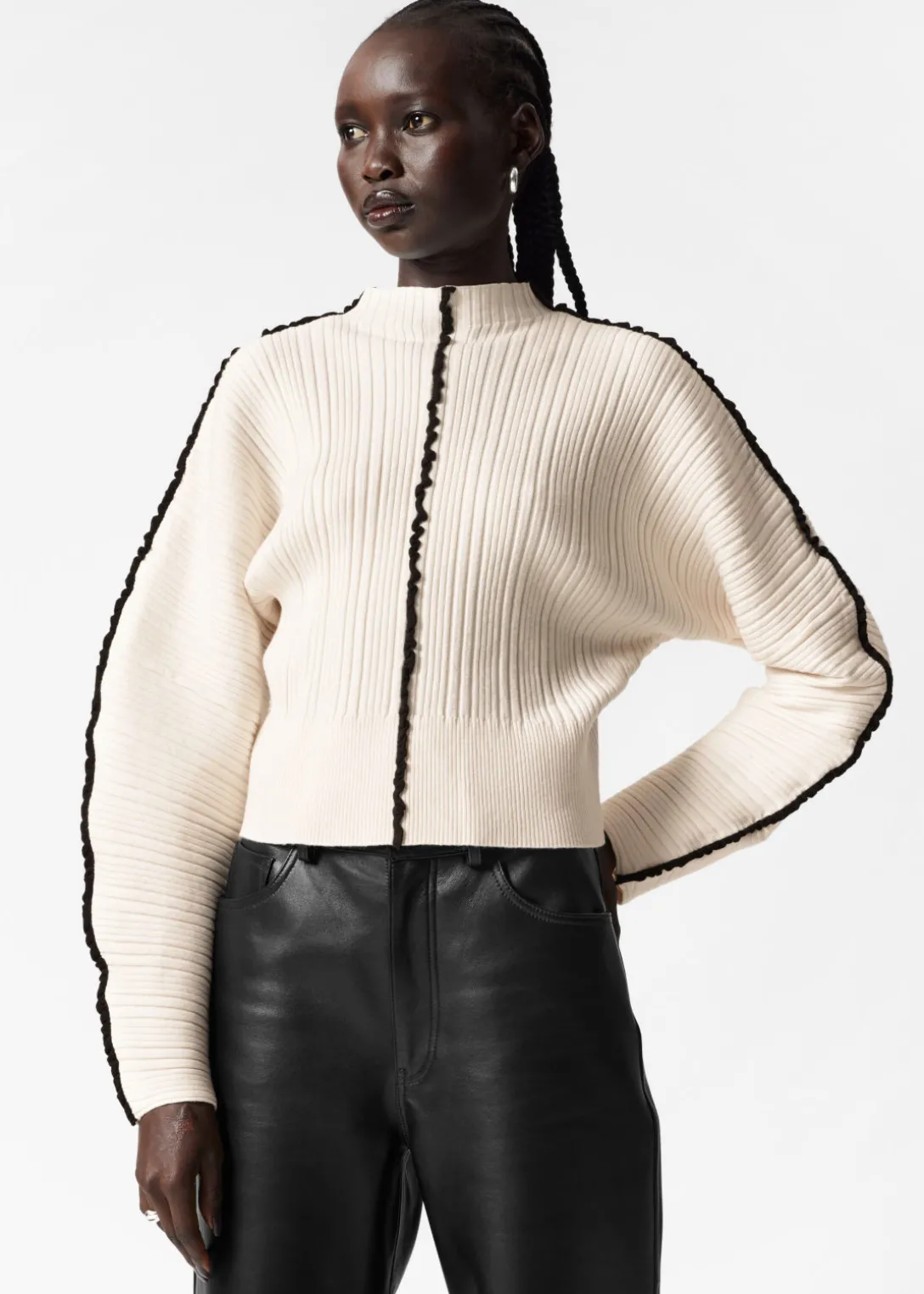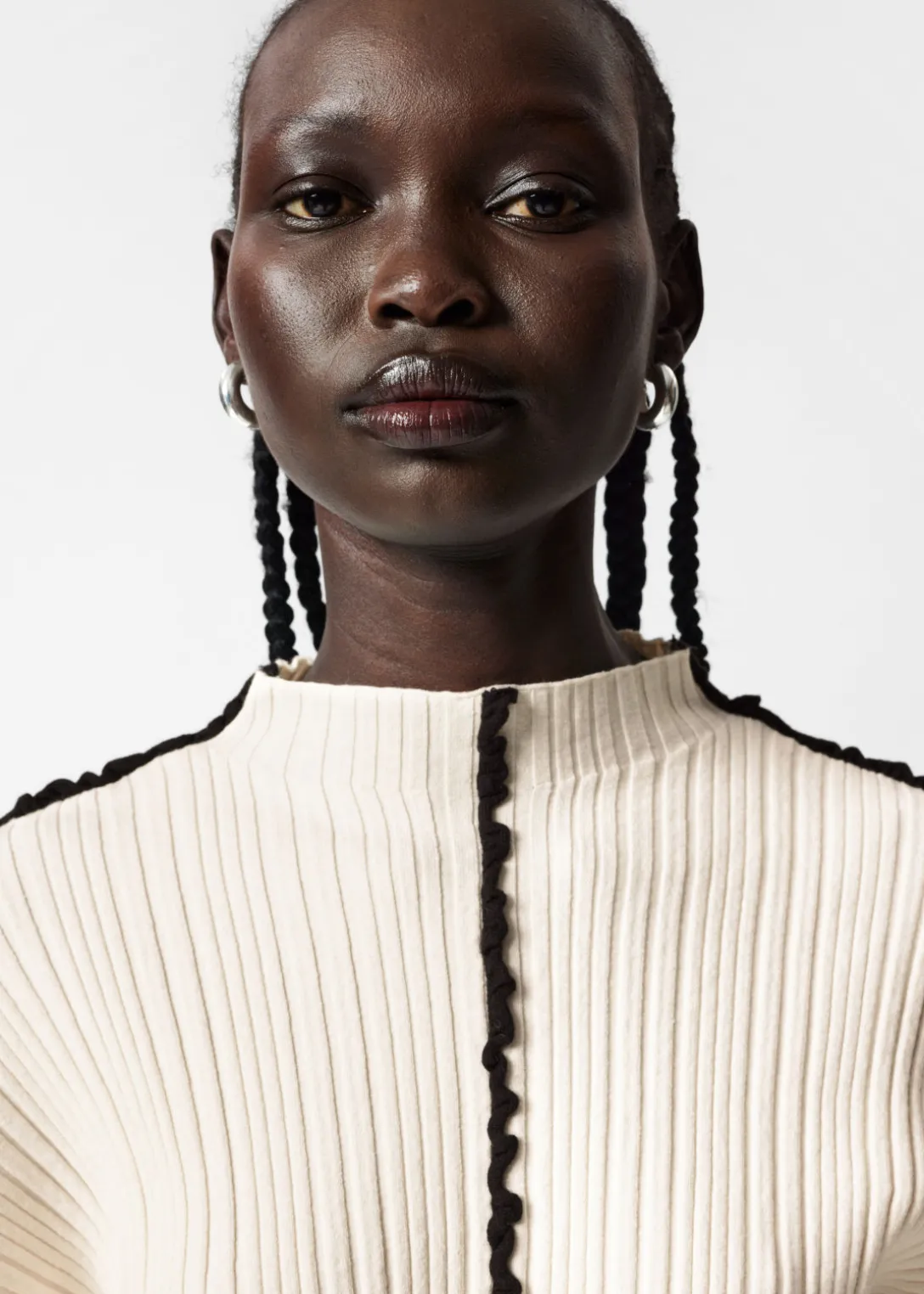 Pull à col montant et maille côtelée, avec des détails volantés contrastés sur les manches et le corps.