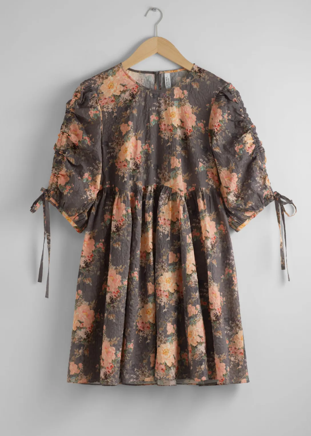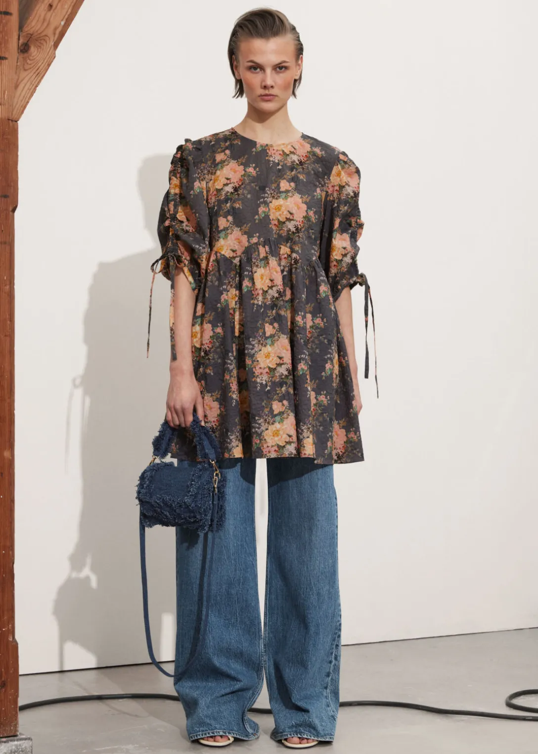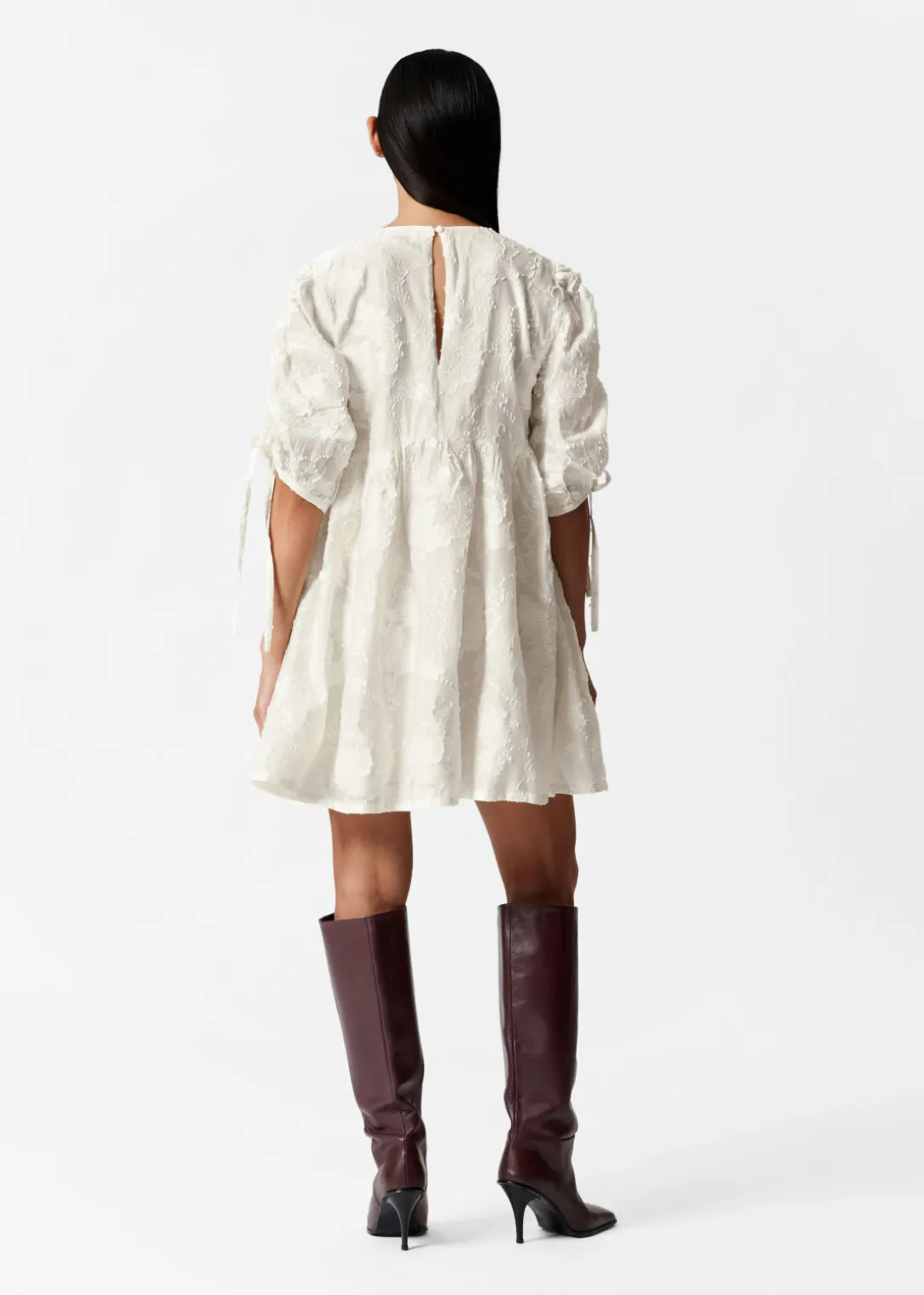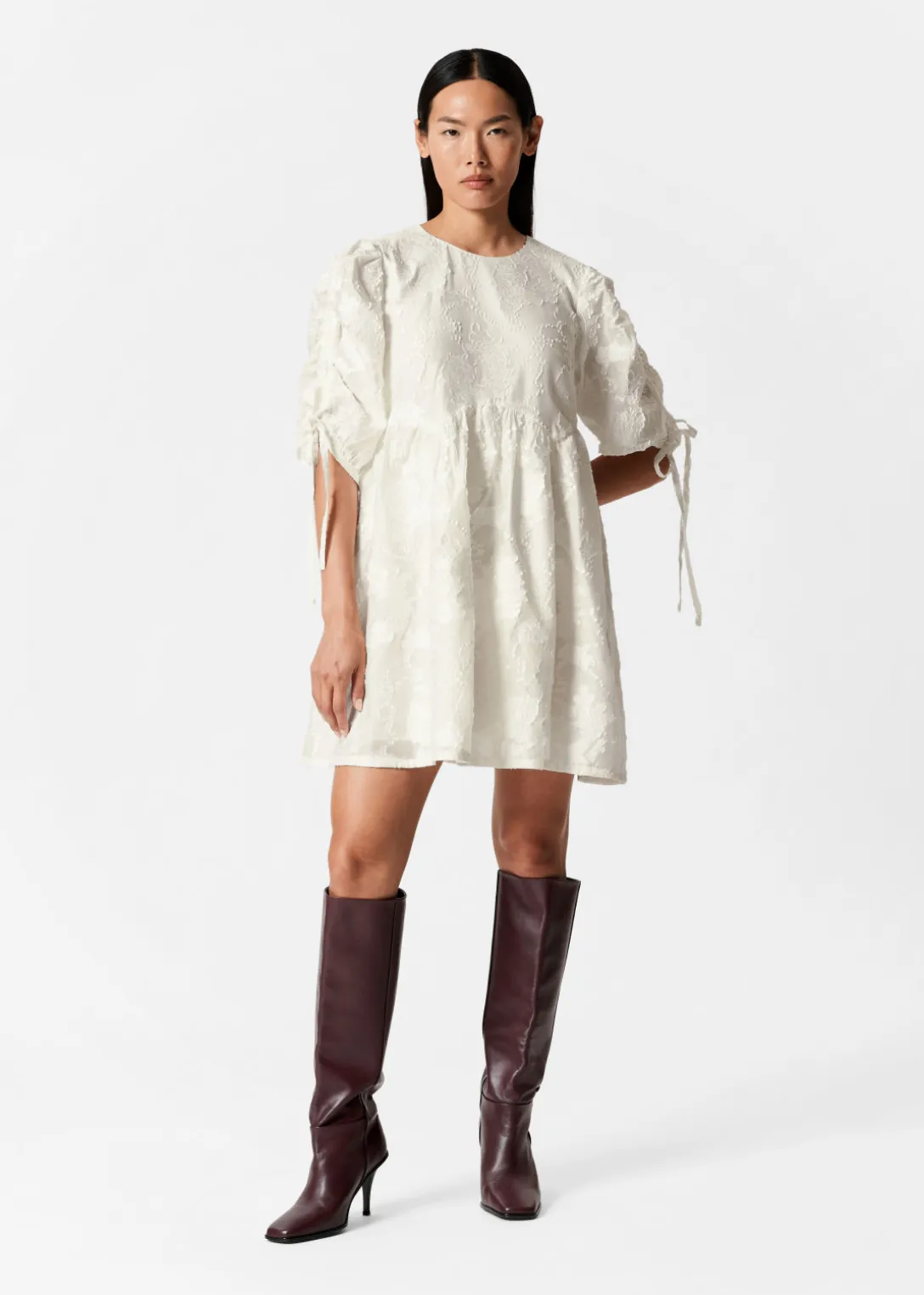 Robe courte avec des manches volumineuses trois-quarts, ornées de cordons de serrage et de liens à nouer en bas.
