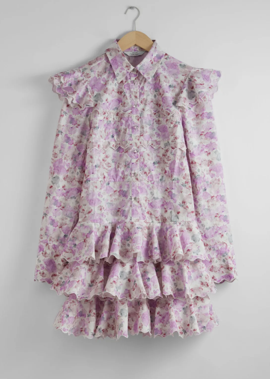 Robe courte à col, avec des volants superposés au niveau des épaules et de l’ourlet. Ornée de détails festonnés sur les bords.