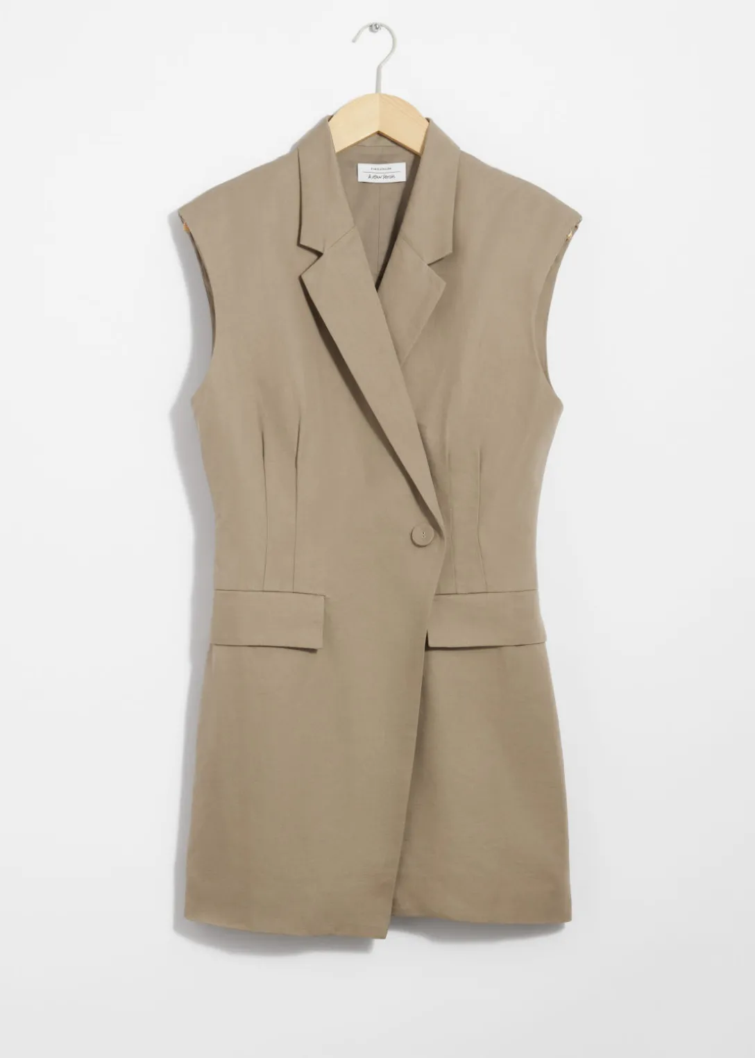 Robe courte blazer sans manches avec une taille accentuée et des épaules rembourrées pour une silhouette structurée.