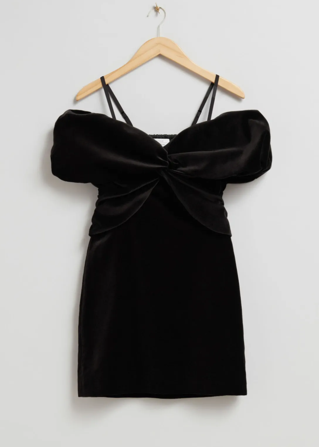 Robe courte en velours, avec épaules dénudées et effet portefeuille.