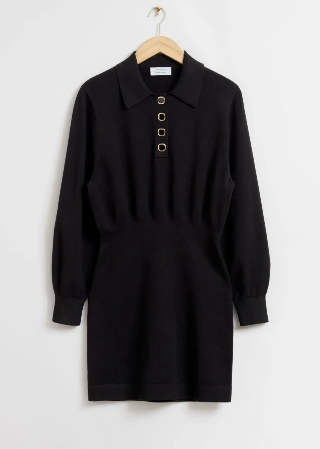 Robe courte polo en maille avec large col rabattu, épaules tombantes, patte de boutonnage ornée de boutons en émail doré, taille cintrée et poignets côtelés.