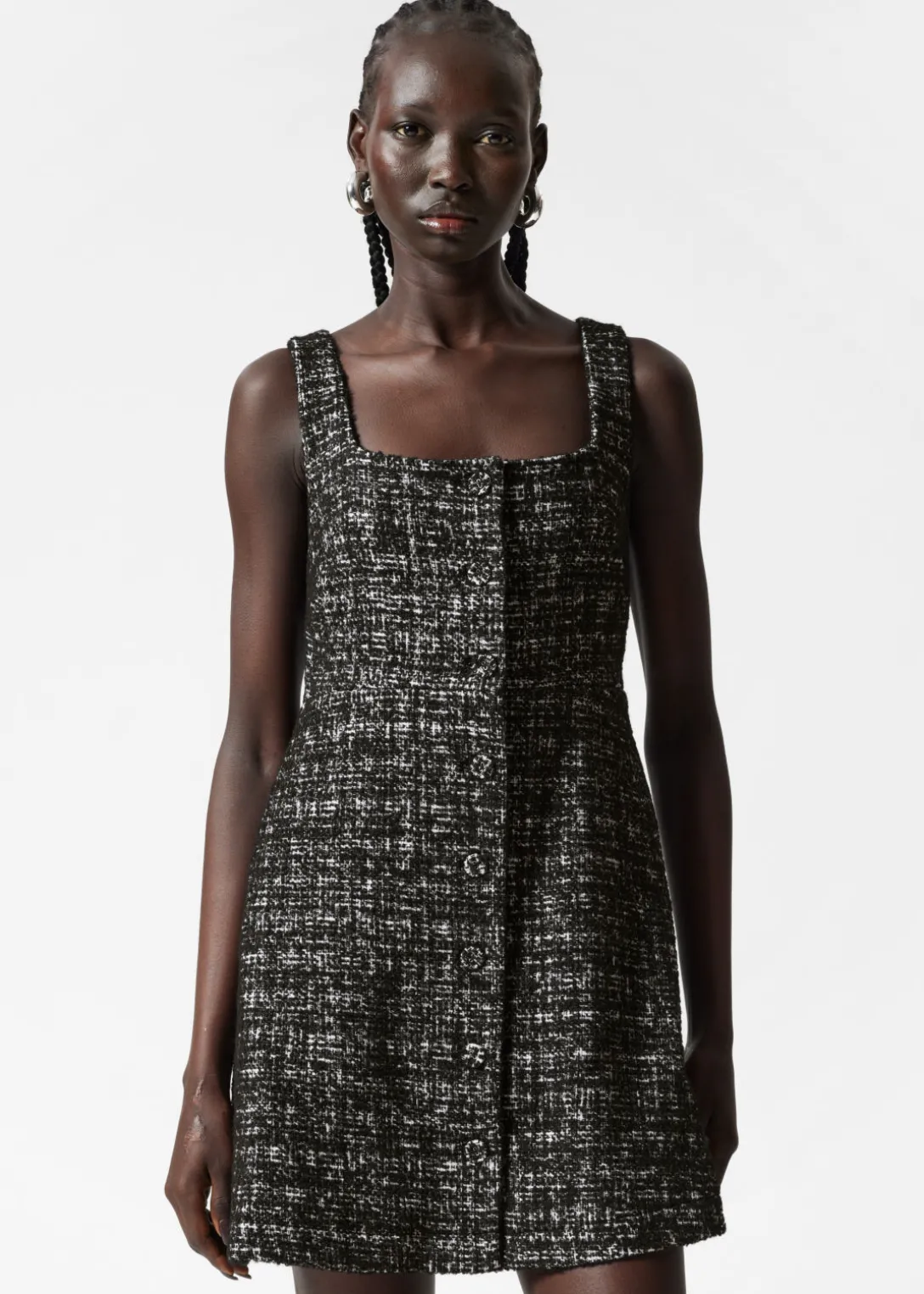 Robe trapèze courte sans manches en tweed, avec une fermeture boutonnée au centre à l’avant et deux poches prises dans les coutures latérales.