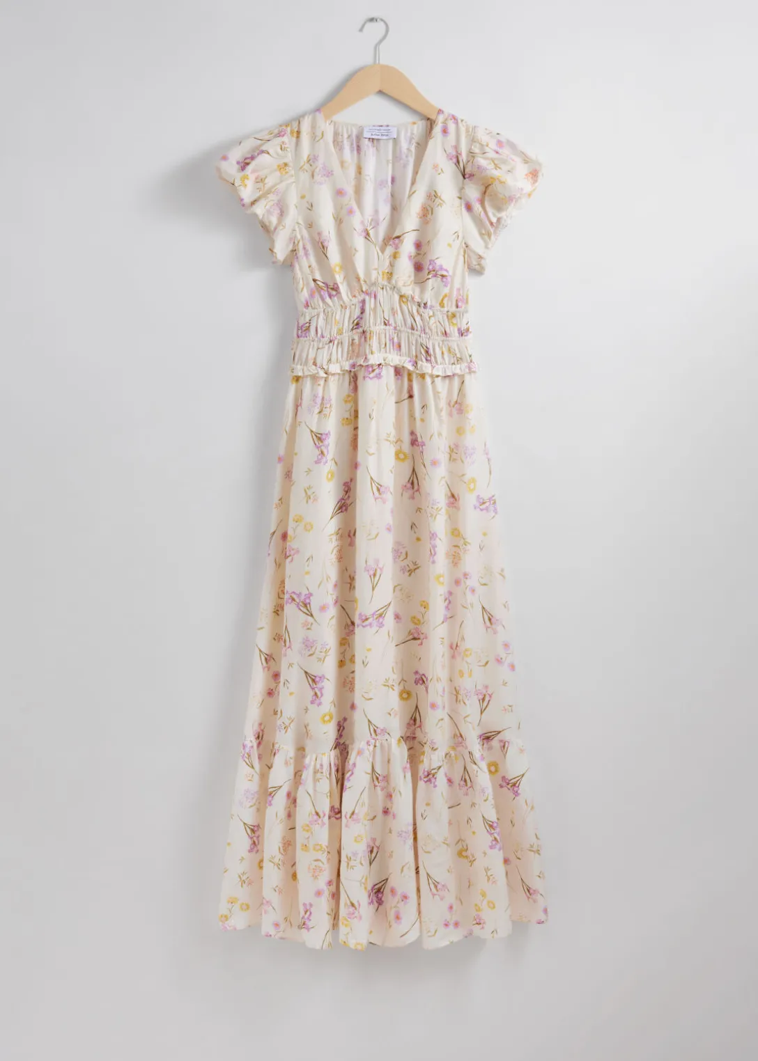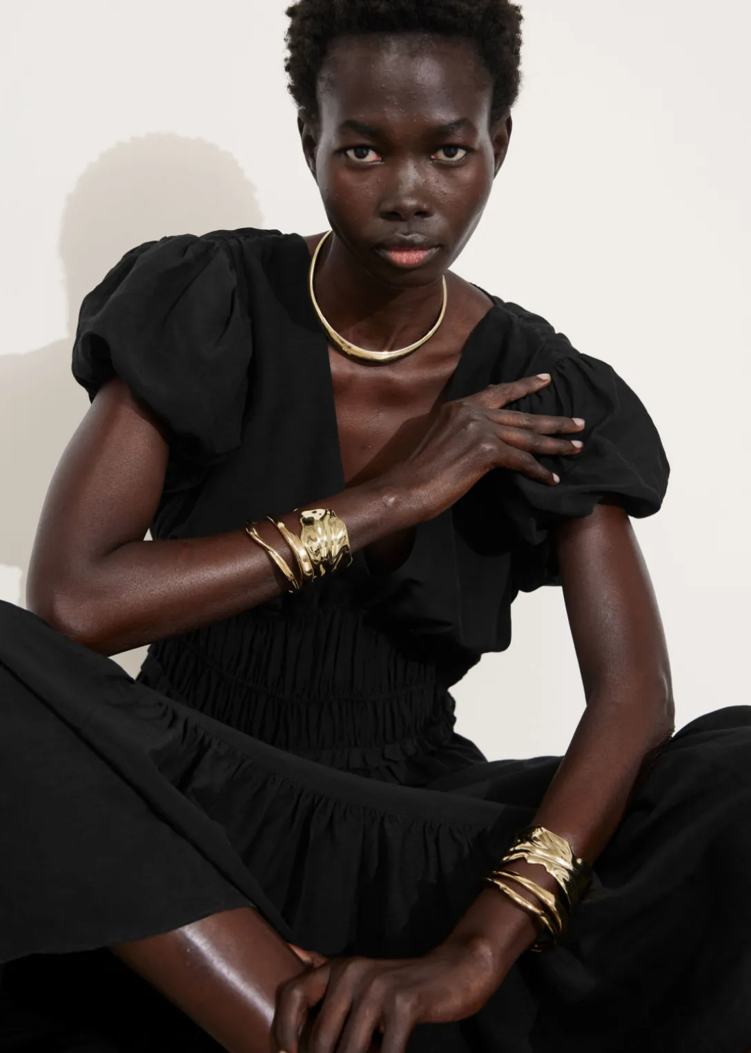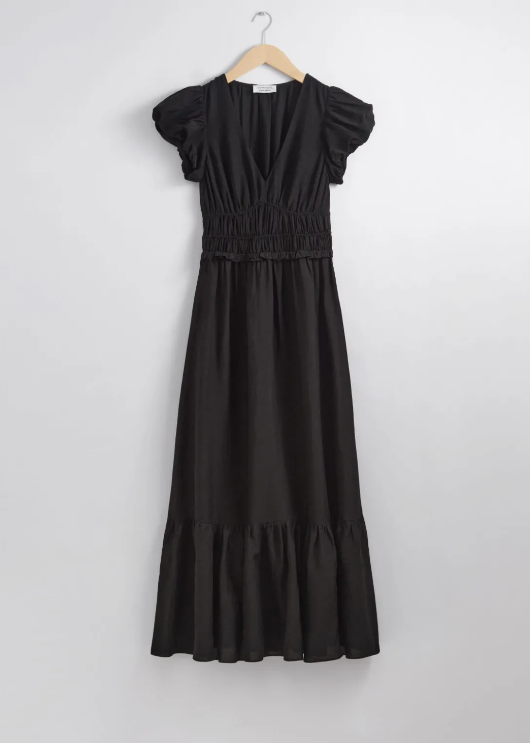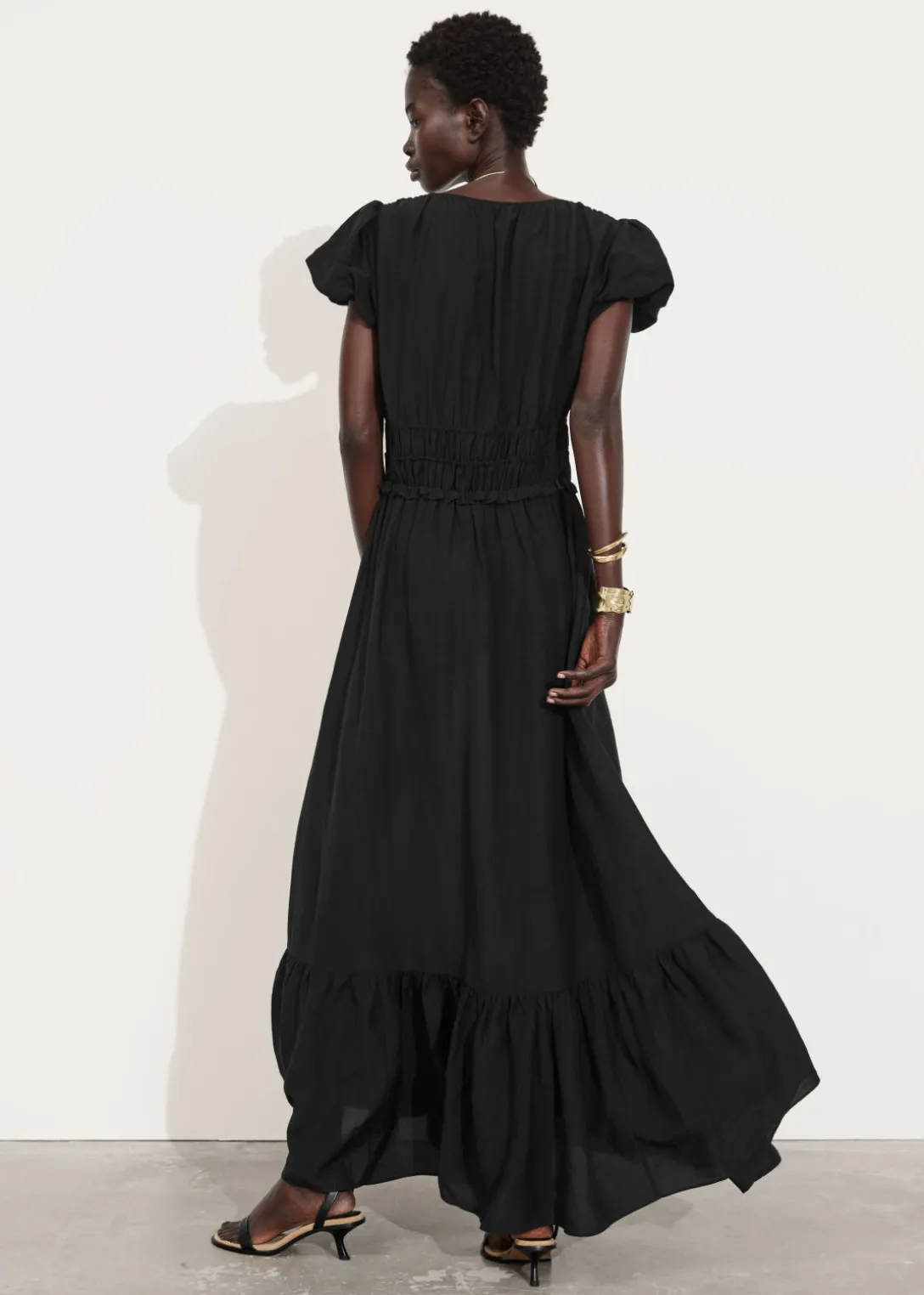 Robe longue avec des manches ballon et une jupe à plusieurs niveaux.