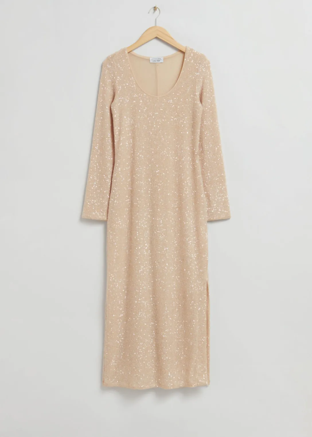 Robe longue à manches longues avec finition pailletée. Elle présente une encolure dégagée et une fente latérale.