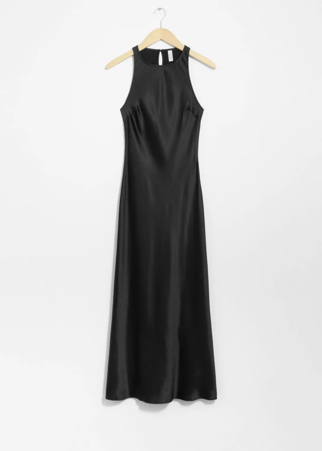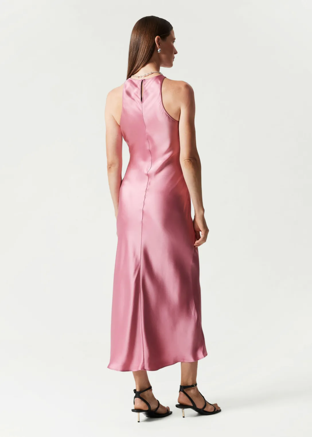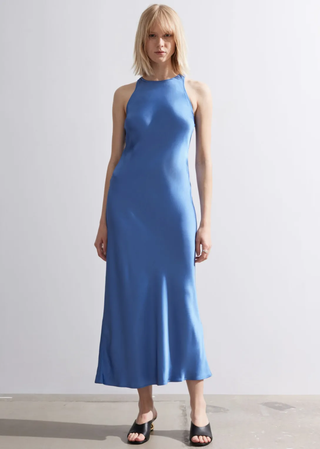 Robe midi sans manches en satin, avec des pinces au niveau de la poitrine.